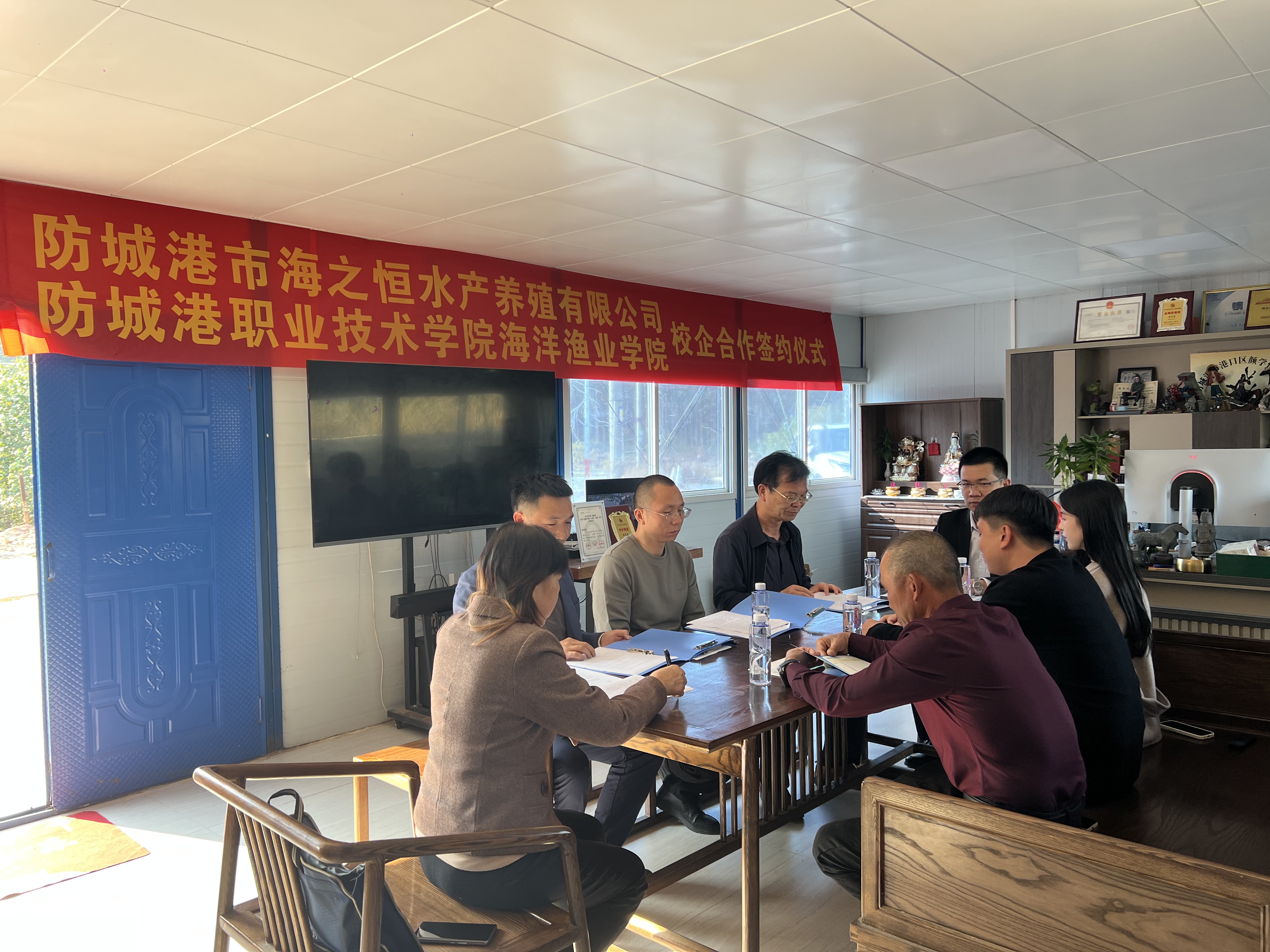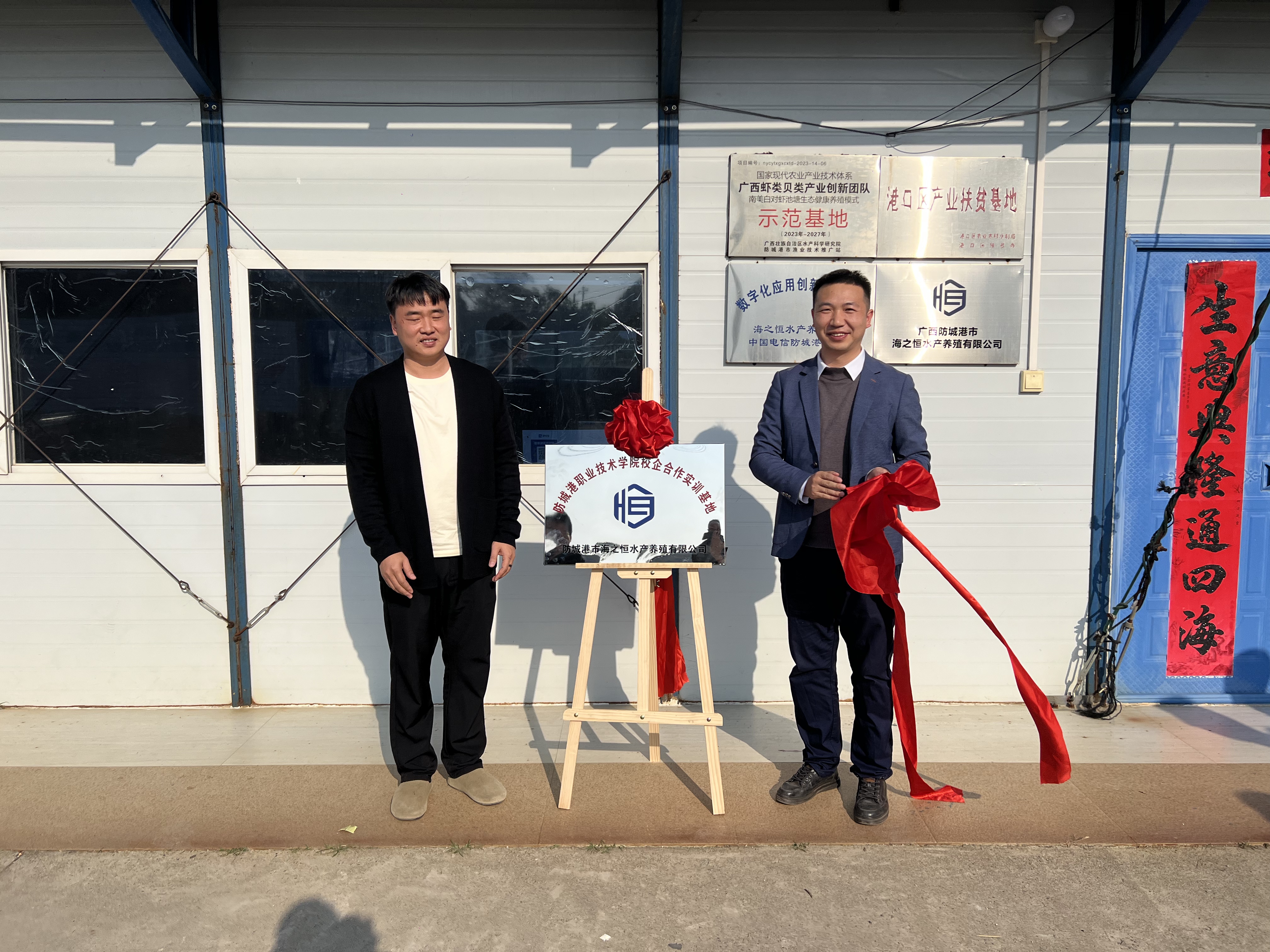 防城港市港口区海洋局副局长覃江韬,公司董事长颜学快、总经理颜有蓬,学校副校长刘兵权,银龄专家许富繁、罗蔓,海洋渔业学院副院长徐俊龙等共同出席活动,见证签约并为“校企合作实训基地”揭牌。