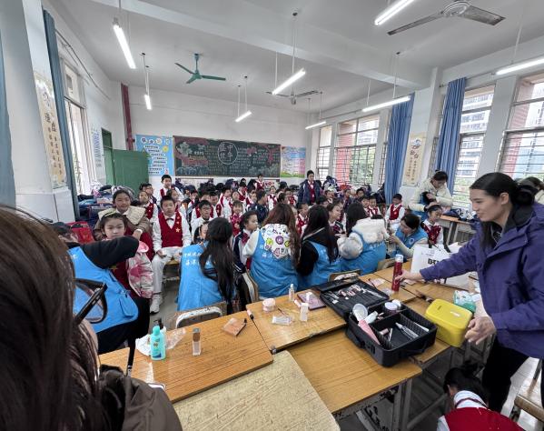 活动以“党建带团建”为根本遵循,汇聚学院党支部成员、入党积极分子及学生团员共计25人,组建起一支有担当、有温度的志愿服务队伍。当日下午,志愿者们准时集结出发,抵达学校后迅速与教职工对接衔接,即刻投入前期筹备工作。大家分工协作、各司其职,部分志愿者俯身细致为小演员打理发型、整理仪容,其余人员则高效完成化妆区域的布置与清洁消毒工作,以严谨的准备为后续化妆环节筑牢保障防线。