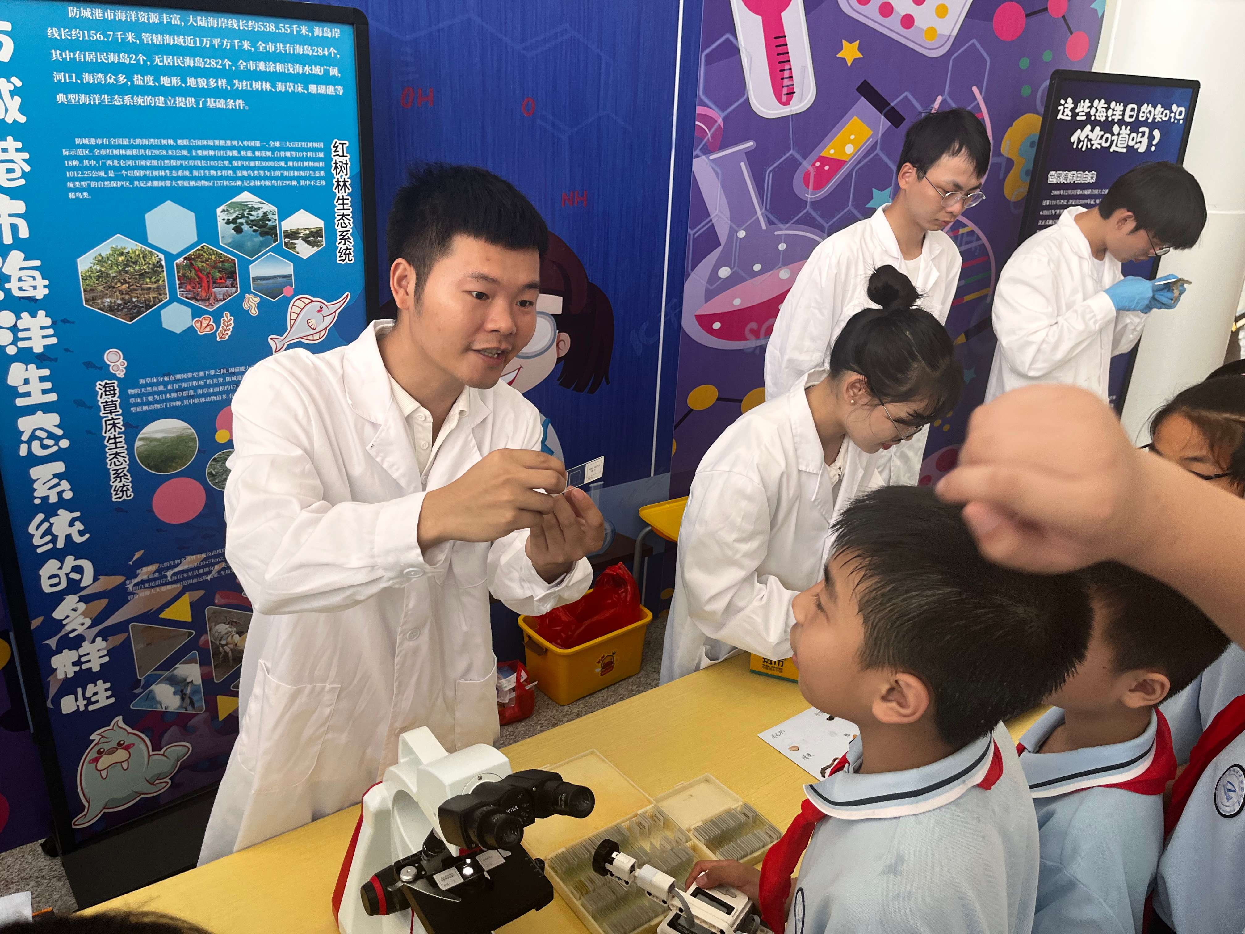 在馆校合作科普环节中,学院负责人徐俊龙带领教师卢文麒、林金姬、陆鑫在现场进行了水产知识宣讲,并演示了水产动物的解剖和如何使用显微镜观察微生物,吸引了许多小学生前来体验。在老师们的耐心指导下,同学们积极主动尝试,场面热闹非凡。此次活动不仅丰富了大家对水产动物和微生物的认识,也加深了对水产行业的了解。
