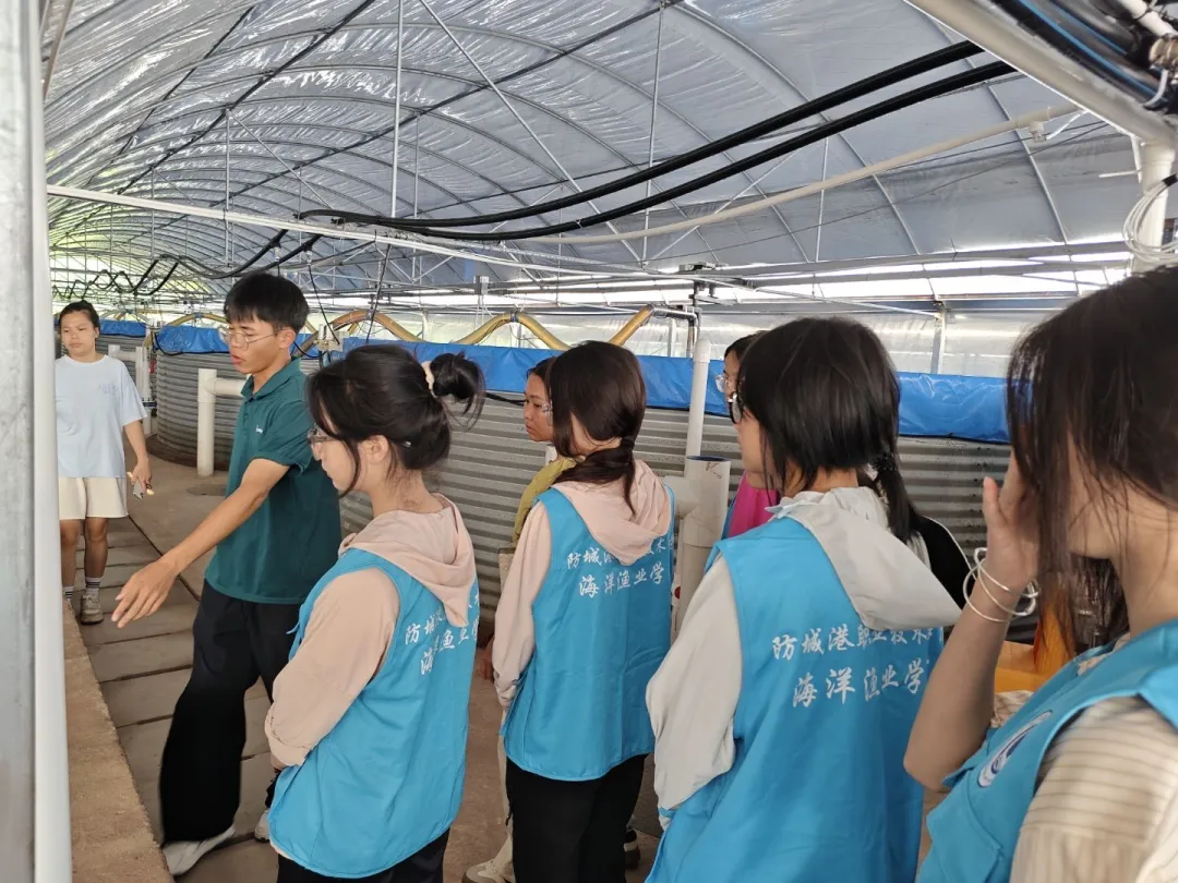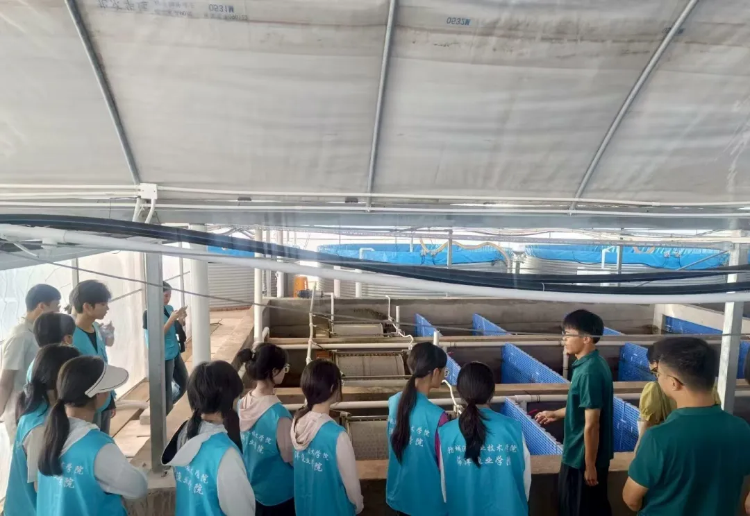 随后,海洋渔业学院师生们走进养殖棚内,技术负责人为大家详细讲解了虾类不同生长阶段的管理要点和智能化系统的实际应用成效。从苗种选育到成虾养殖,从水质调控到投喂策略,AI的介入使得整个生产流程更加精准、高效、可控。这场近距离的科技体验,让同学们深切感受到智慧渔业的广阔前景,也进一步坚定了投身海洋强国建设的信念。