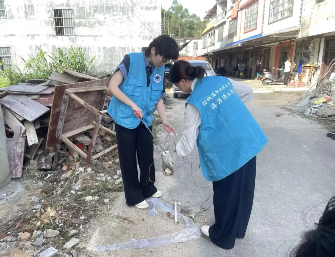 实践团首站走进防城港十万山瑶族乡木排村,开展“净美乡村”志愿服务。同学们手持锄头、扫帚、垃圾袋等工具,分组协作、不畏酷暑,对村委会大院及周边道路的杂草、垃圾进行彻底清理。随后,团队前往木排村打石坪归侨组,沿路捡拾塑料包装、废弃纸张等生活垃圾,并进行分类处理。一抹抹“渔业蓝”在乡间小路跃动,以实际行动改善村容村貌,传递生态文明理念。