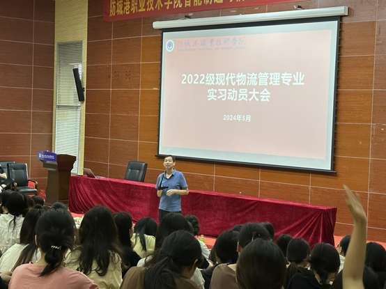 2024年5月17日,我系在图书馆报告厅召开了2022级学生实习动员大会。会上,经济管理系负责人马梦远给物流专业的学生进行了实习动员宣讲。鼓励大家积极到企业中去锻炼,磨炼技能,增强本领。