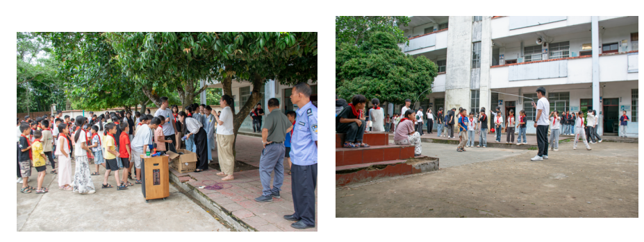 此外,我院还为边境小学带去了丰富多样的棋类和运动器材,包括五子棋、篮球、羽毛球拍等。在运动互动环节,大学生们和小学生组队,一起开展篮球友谊赛、羽毛球对打、趣味跳绳等活动。在挥洒汗水中,孩子们尽情享受运动带来的快乐,同时增进了与大学生之间的情谊,激发了对体育运动的热爱。