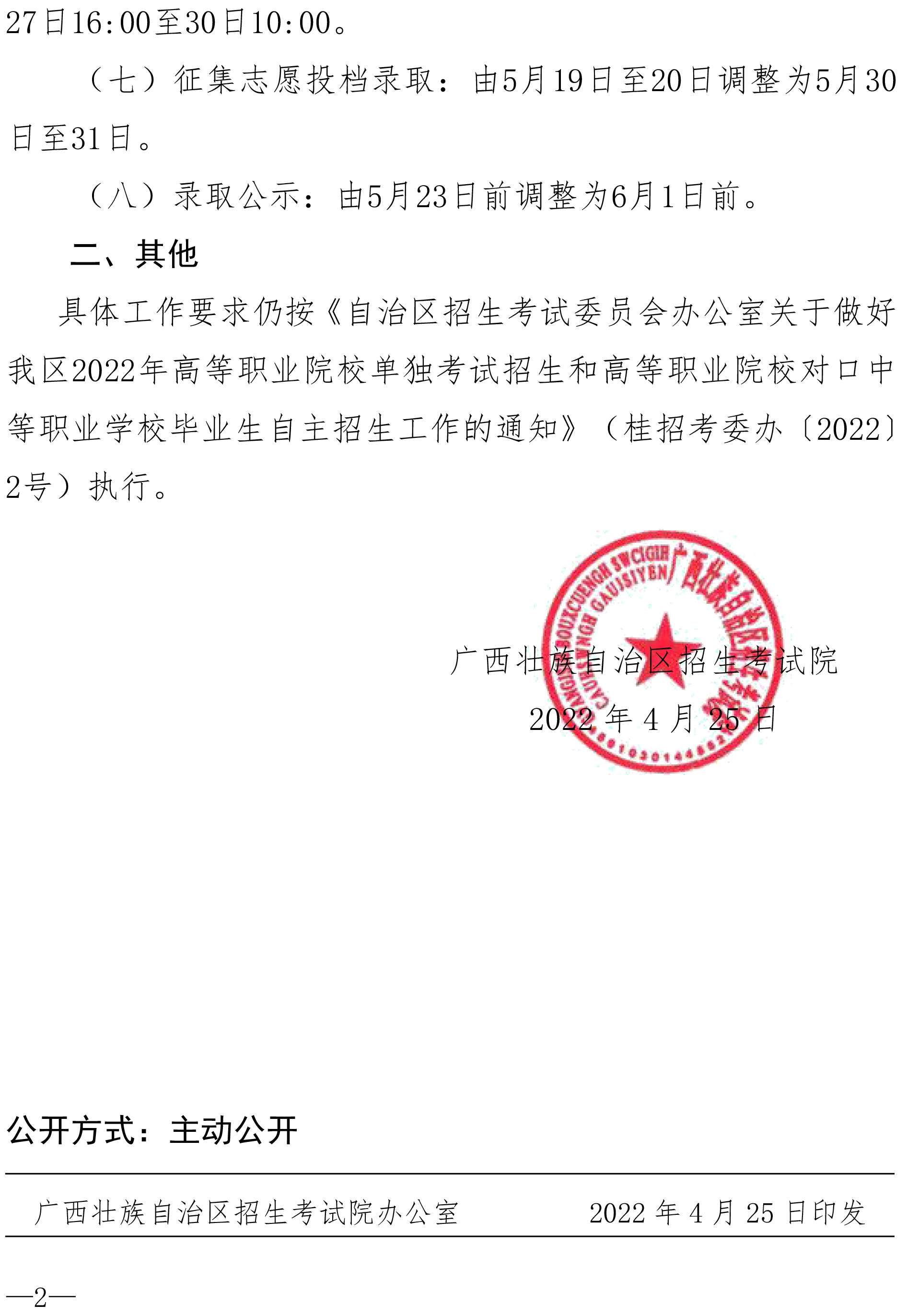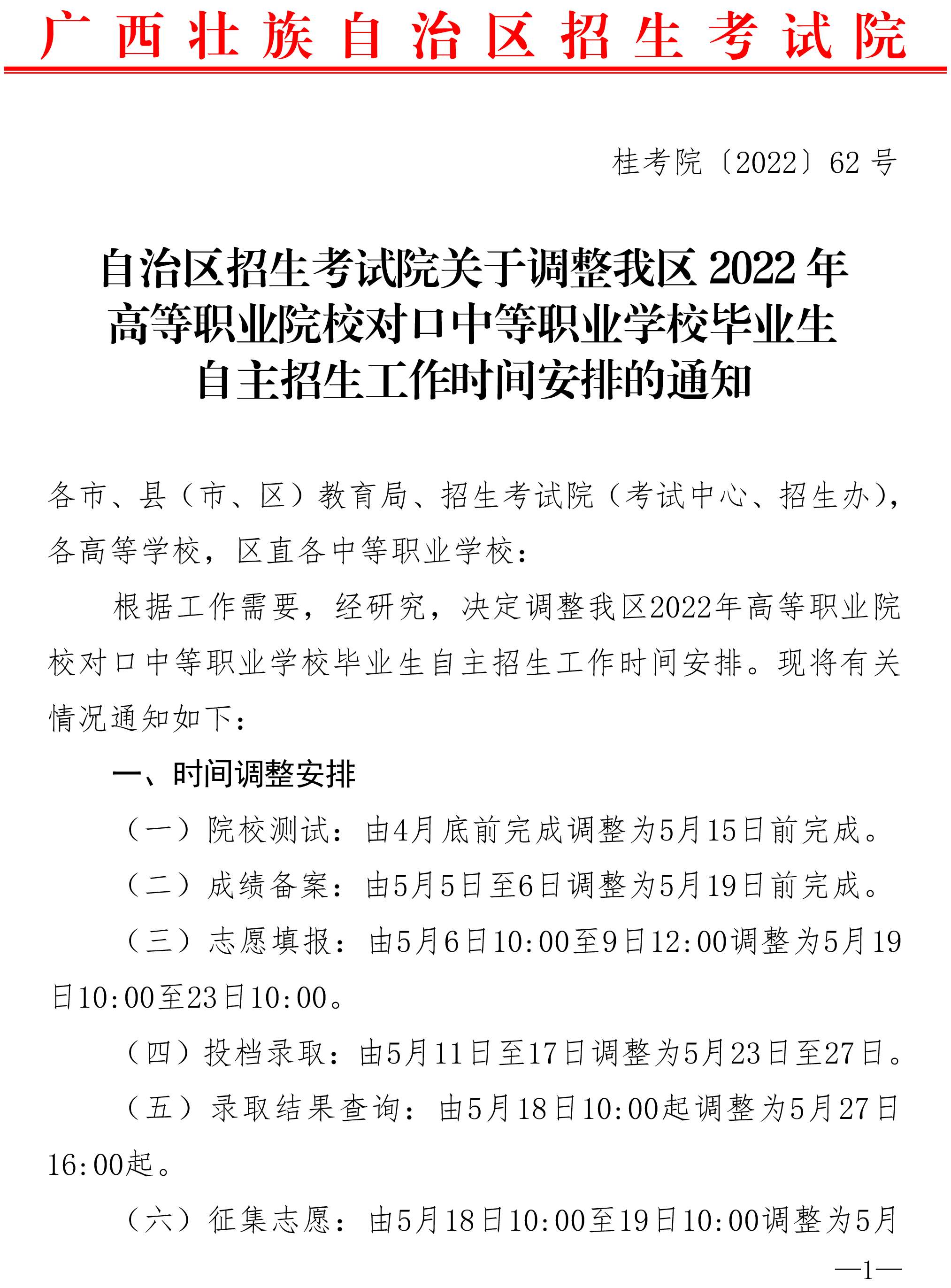 自治区招生考试院关于调整我区2022 年 高等职业院校对口中等职业学校毕业生 自主招生工作时间安排的通知