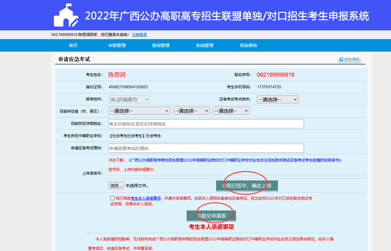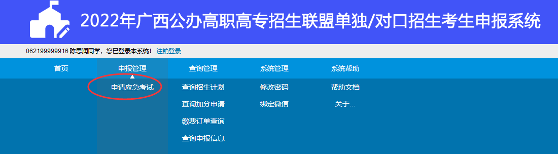 四、申报方式:登录2022年广西公办高职高专招生联盟单独/对口招生考生申报系统(https://www.gxgzlm.com/),选择“申请应急考试”菜单,填写申报信息。