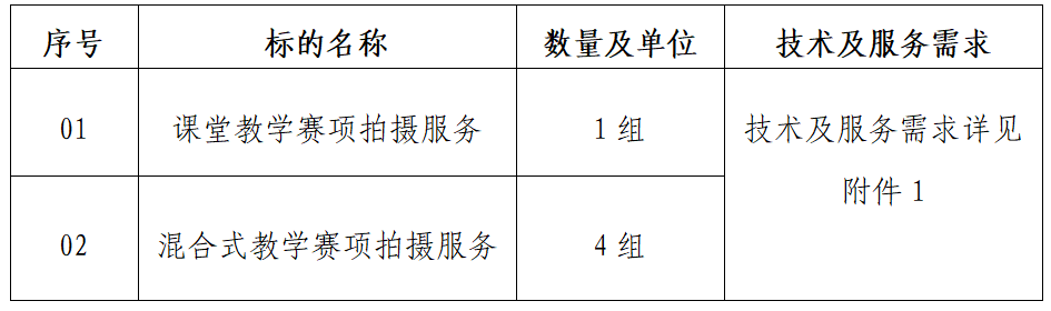 1  | 课堂教学赛项参赛作品拍摄服务  | 1组  | 一、制作内容 ★1.共计拍摄制作1组:录制1学时(40-45分钟)课堂教学实录视频4个。 ★2.对比赛文档类材料、PPT进行排版、美化。 3.每段课堂实录视频由采购人自行选择教学场景,并完整、清晰地呈现相对独立完整、课程属性特质鲜明、反映团队成员教学风格的教学活动实况,录制过程中能看到全体学生。 ★4.课堂实录视频须采用3机位全程连续录制,镜头固定,其中一个机位对准黑板和屏幕,另两个机位根据教学实际固定镜头位置,须覆盖教室全景(1学时教学需要两个教学场所的,每个教学场所均须安放固定镜头,机位总数为3个)。3机位须同步录制,保证音视频准确同步。录课过程中拍摄及其他人员不在场,提交的视频从拍摄人员离场开始到拍摄人员停机为止(1学时之外的录制时长不超过2分钟)。所有机位拍摄的视频须保证音轨连续,不另行剪辑及配音,不加片头片尾、字幕注解,不泄露地区、学校名称。不含中文(唱词)字幕制作。 ★5.每个参赛作品组实际拍摄总工时不少于50个小时。 6.提供课程拍摄注意事项文件,现场拍摄指导及注意事项。 ★7.视频采用MP4格式封装,单个视频文件大小不超过500M。每段视频文件以“教案序号+第几学时+教案页码+教学环节名称”来命名(其中教案页码以教案PDF 文件顶部显示的页码为准)。 ★8.视频采用H.264/AVC编码格式压缩;动态码流的码率不低于1024Kbps;1280×720(高清16:9拍摄);采用逐行扫描(帧率25帧/秒)。音频采用AAC(MPEG4 Part3)格式压缩;采样率48KHz;码流128Kbps(恒定)。 二、视频录制使用器材要求 ★1.等于或优于4k的摄像机。 2.三脚架固定机位配置三脚架脚轮。 ★3.如若拍摄场地光线不足,要使用到灯光、灯光设备由成交供应商提供。 三、制作团队要求 1.制作团队包含课程经理、编导、课程顾问各一名以及摄像团队、后期团队,保证团队构成稳定。 2.编导具有广播电视从业经验。 3.摄像具有影视从业经验,同时具备影视后期制作能力,有较强的实时构图能力,能实现无剪辑拍摄,确保课堂内容呈现清晰明了,准确传达课堂教学内容。熟知本届教学能力大赛的参赛规则及相关要求。 四、制作服务要求 1.制作服务流程: (1)课程编导要参与到课程规划和设计中,在拍摄之前与教学团队就课程拍摄脚本提案做充分沟通,明确教师拍摄要求,根据课程授课安排设计拍摄流程并与主讲教师确认。 (2)课程编导与教师团队确定拍摄时间安排。 (3)拍摄团队提前入场,协助教师负责拍摄场地、教学道具、教学环境的布置,并提供试镜服务。 (4)正式录制:课程编导全程负责,指导教师服装、语言、站位等,以达到最佳拍摄效果。 (5)每次录制完成成片给教师审核,如不满意,在规定拍摄总工时内可以复拍,直至教师审核通过。 2.服装道具化妆要求: (1)需提供化妆服务,并全程跟妆。 (2)对参赛队员提供服装穿着建议。 (3)实景外景拍摄时需对场景进行有效设计,规避不美观的元素。 (4)道具的布置需与被摄内容相符。 3.作品提交要求:所有作品制作完成后,需要把成品、原素材存进一个公司提供的U盘,交给学校保存。  |