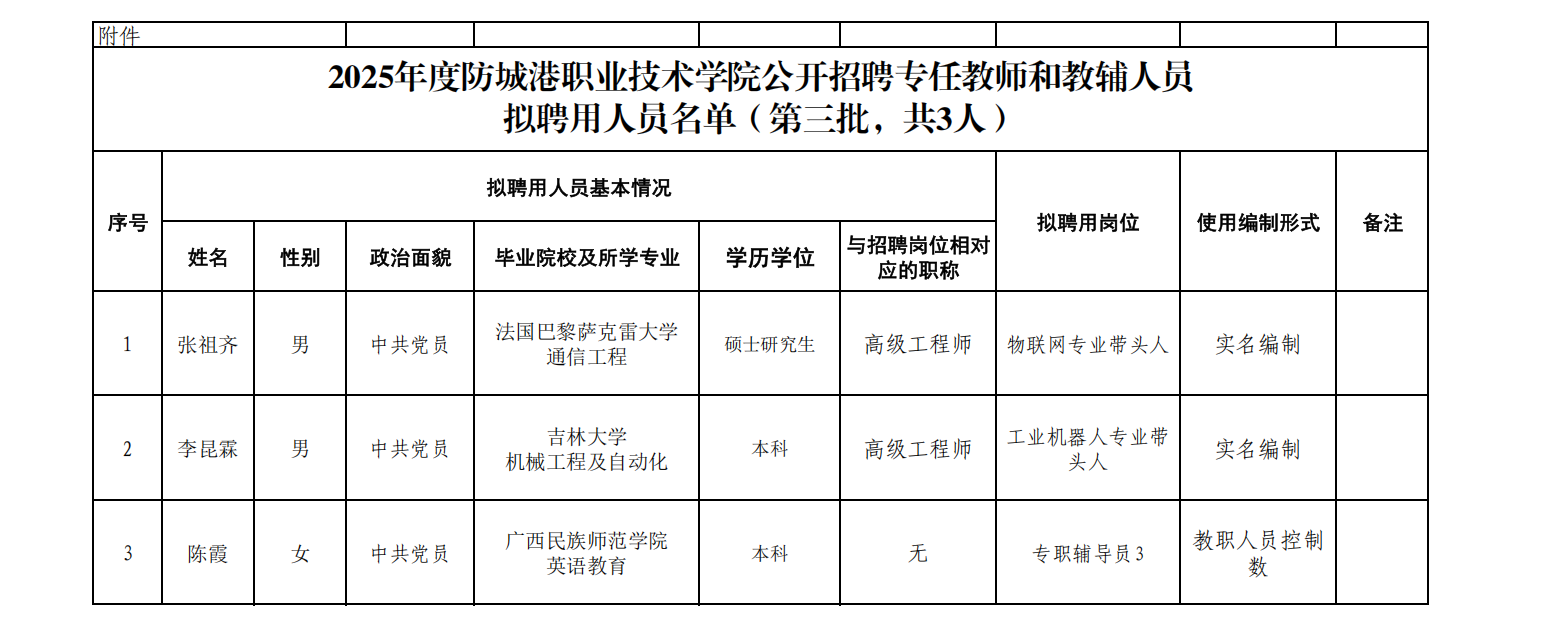 附件:2025年度防城港职业技术学院公开招聘专任教师和教辅人员拟聘用人员名单(第三批,共3人)