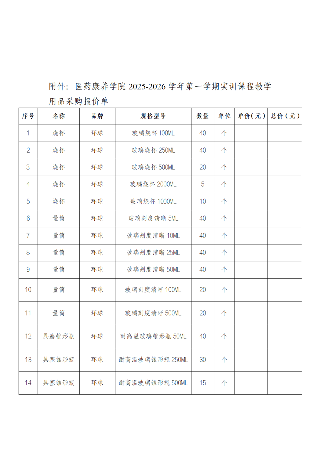 附件:医药康养学院2025-2026学年第一学期实训课程教学用品采购报价单