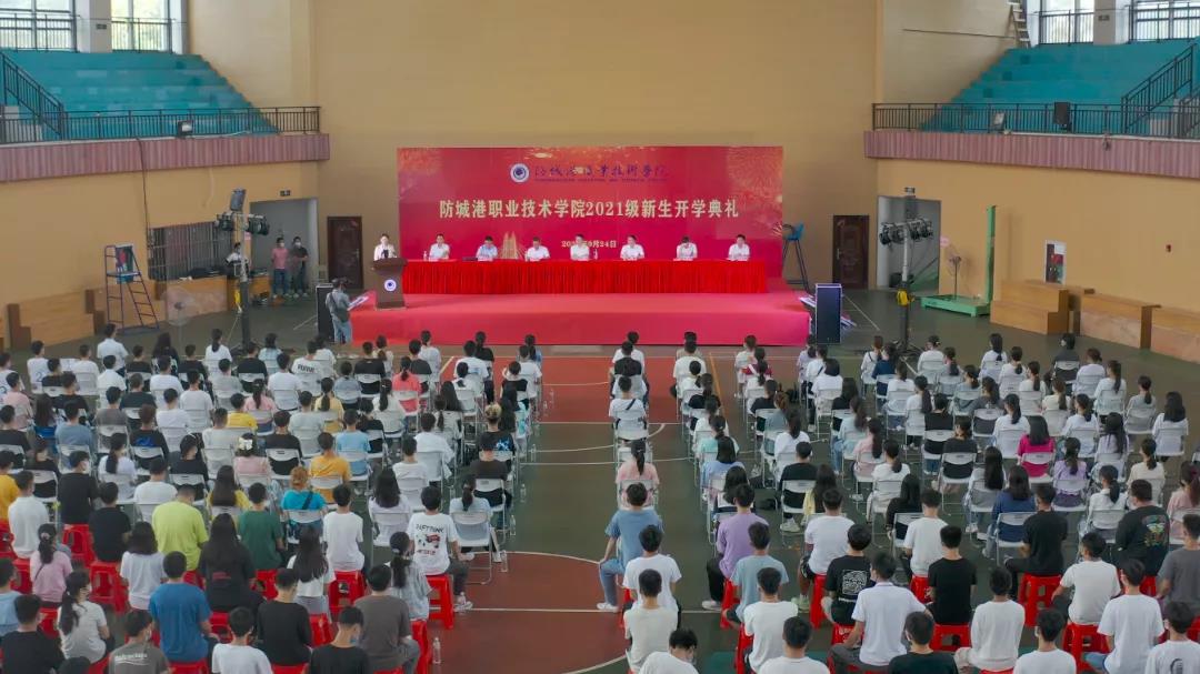 市人民政府副秘书长傅现,防城港职业技术学院副院长刘兵权,广西盛隆冶金有限公司副总经理吕华民,市理工职业学校相关负责人,防城港职业技术学院全体教职工和2021级新生参会。