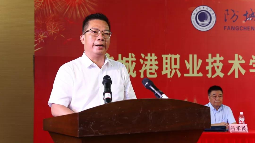 市人民政府副市长许伟出席典礼并致辞。许伟指出,市委市政府高度重视教育,把设立高等院校作为暖心工程、民生工程来抓。从2019年筹建防城港职业技术学院以来,我们一直将这项工作列入《政府工作报告》,出台了《防城港职业技术学院筹建有关重大事项》《防城港职业技术学院筹设实施方案》等文件,市委市政府主要领导、分管领导多次到现场调研指导、开会布置,协调解决建设过程中遇到的困难和问题。经过各方努力,防城港职业技术学院正式招生办学。希望学院在未来发展中,能够扮演补短板的“尖兵”“标兵”角色,与各行各业打出“组合拳”,跳好“团体操”,贯彻落实国家、自治区关于职业教育现代化的决策部署、深化办学机制改革、加强产学研合作,借助特色优势,建成一所立足广西、面向东盟、放眼国际的“双高”职业学院,为社会提供源源不断的高素质人才,为提升防城港的城市文化品位和教育发展层次作出更大贡献。