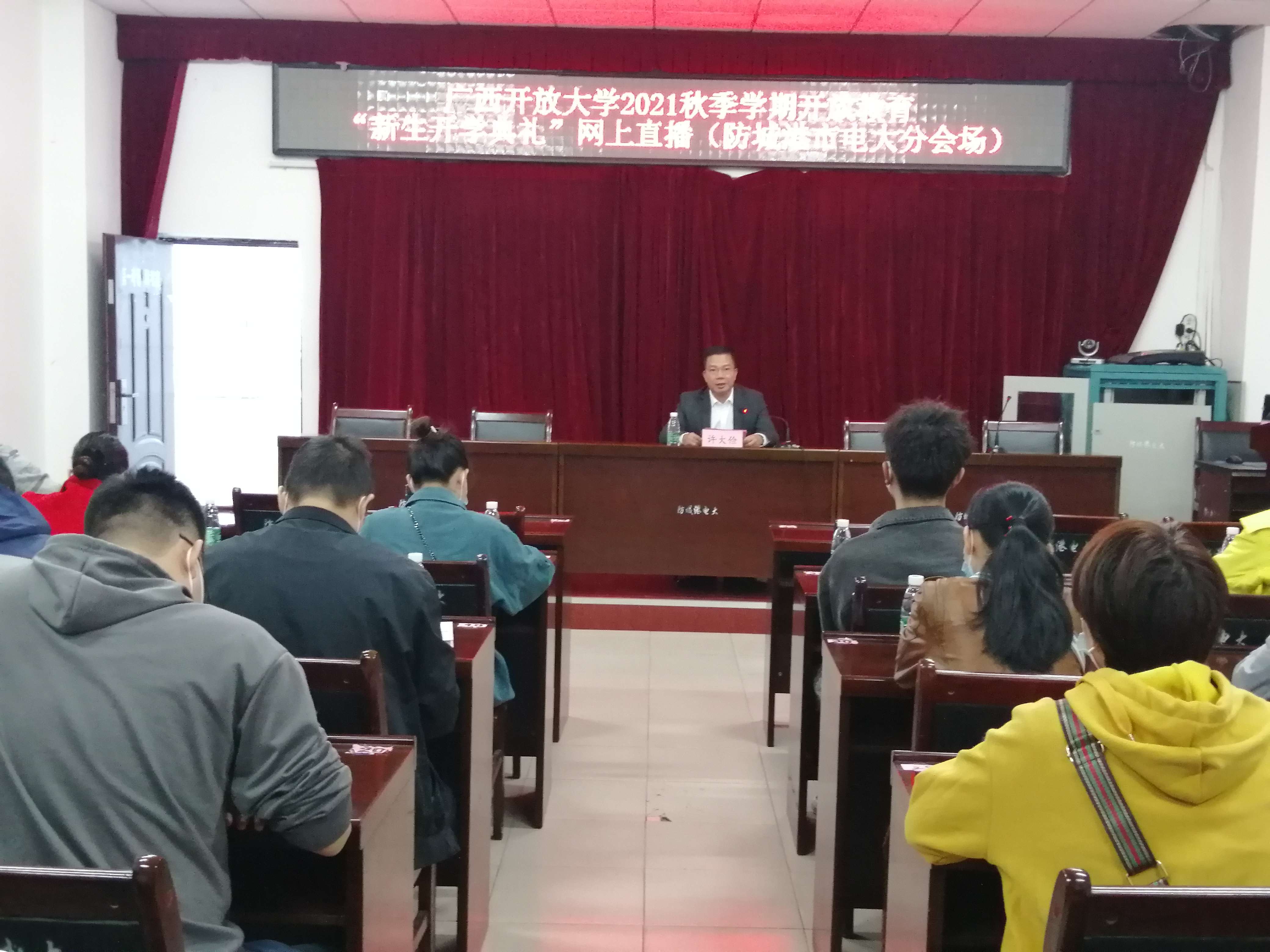 最后,全体师生共同观看了“广西开放大学2021年秋季学期新生开学典礼”网上直播。
