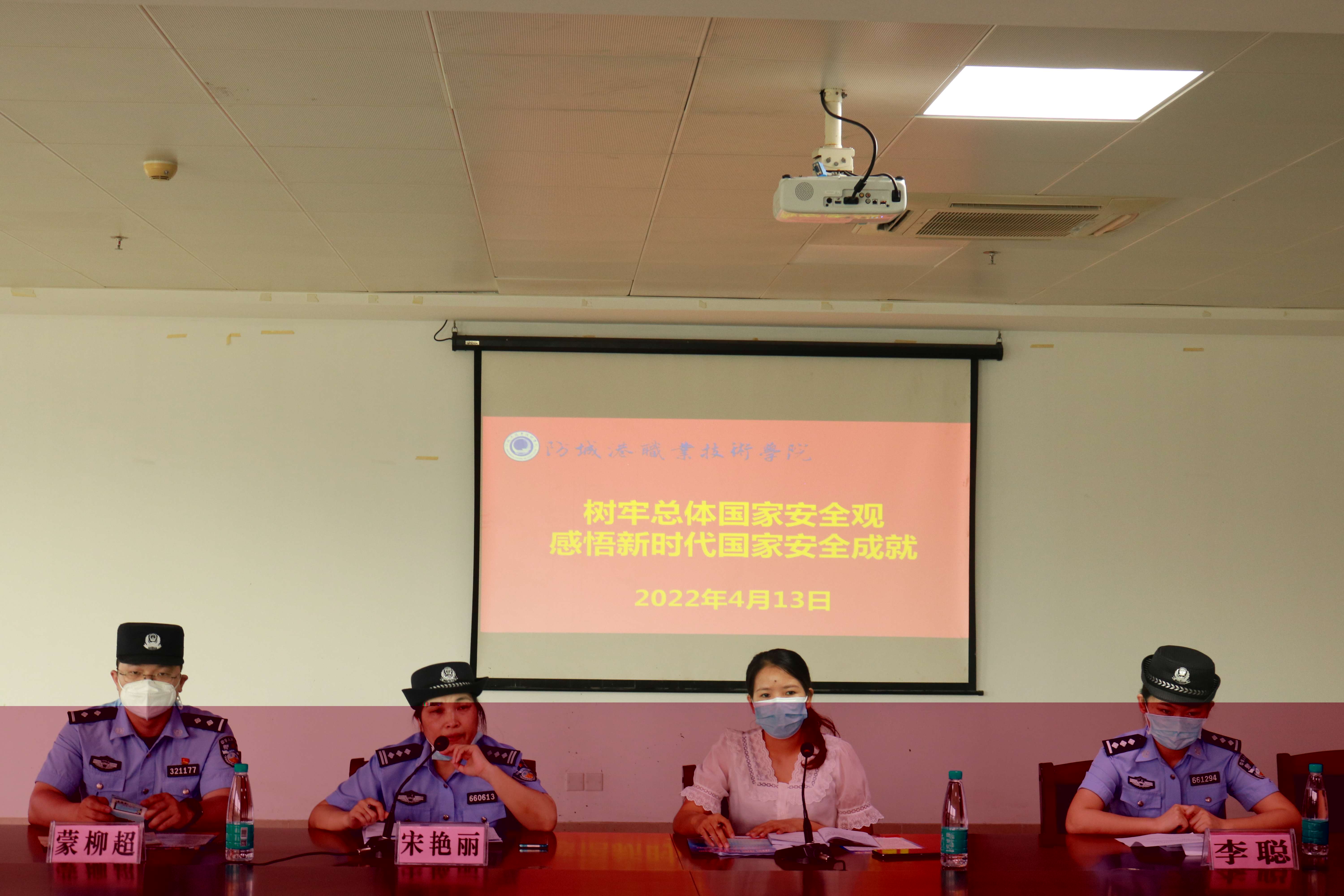 4月13日起,利用全民国家安全教育日重要时间节点,学院分别在官网、微信公众号、电子屏幕、微信工作群等平台,循坏播放全民国家安全教育日宣传视频、宣传主题等,普及总体国家安全观,让广大师生在感悟新时代国家安全成就的同时,不断提升自身的责任感和使命感。同时,学院召开全体教职工大会, 学习习近平总书记关于国家安全的重要论述和国家安全教育有关知识,邀请防城港市公安局防城分局国保大队和网安大队、江山边境派出所公安民警,现场为全体教职工讲解国家安全有关法律法规,对《国家安全法》《反恐法》《中华人民共和国境外非政府组织境内活动管理法》、网络安全知识及如何预防网络诈骗,如何预防校园纠纷事件等进行了普法宣传,并结合学校实际,共同研究校园安全工作,旨在树牢总体国家安全观,打造平安校园。