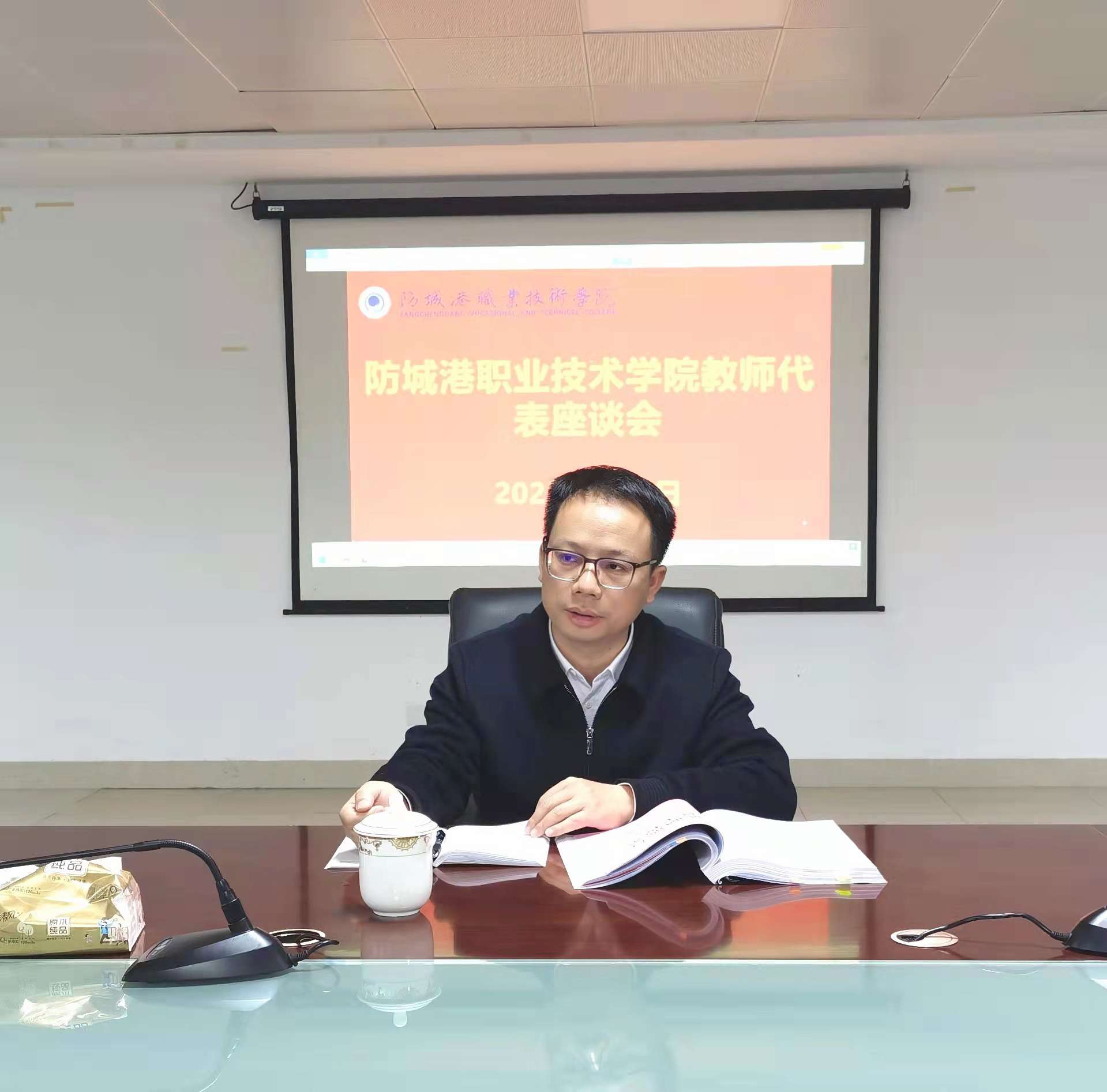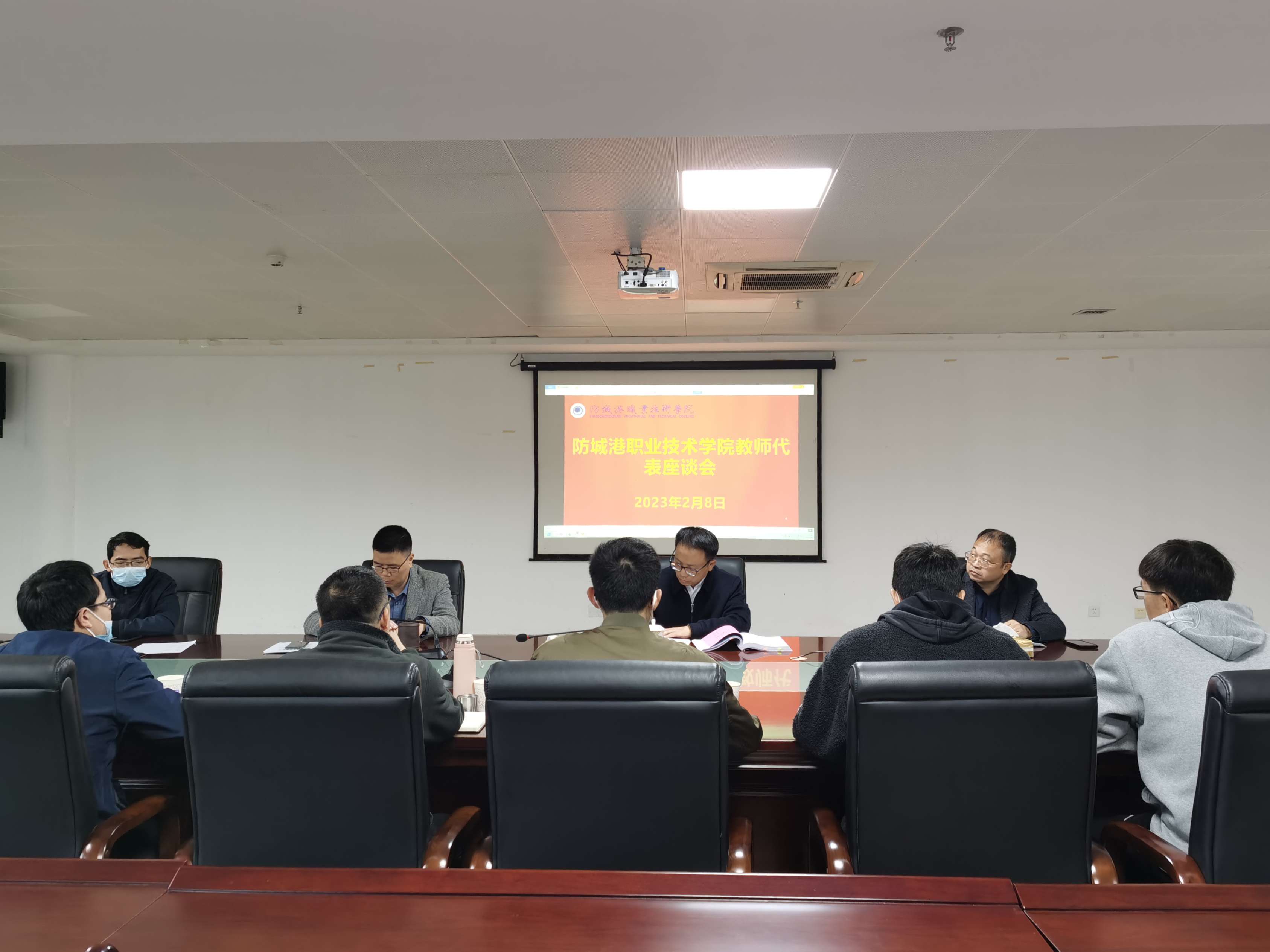 2月8日上午,防城港职业技术学院召开教师代表座谈会,听取一线教师对教育教学管理工作的意见、建议,谋划新学年的工作。学院党委副书记、院长欧阳群东主持会议,党委副书记刘志韬、纪委书记刘振兴出席会议,来自学院各系部的13名教师代表参加了座谈会。