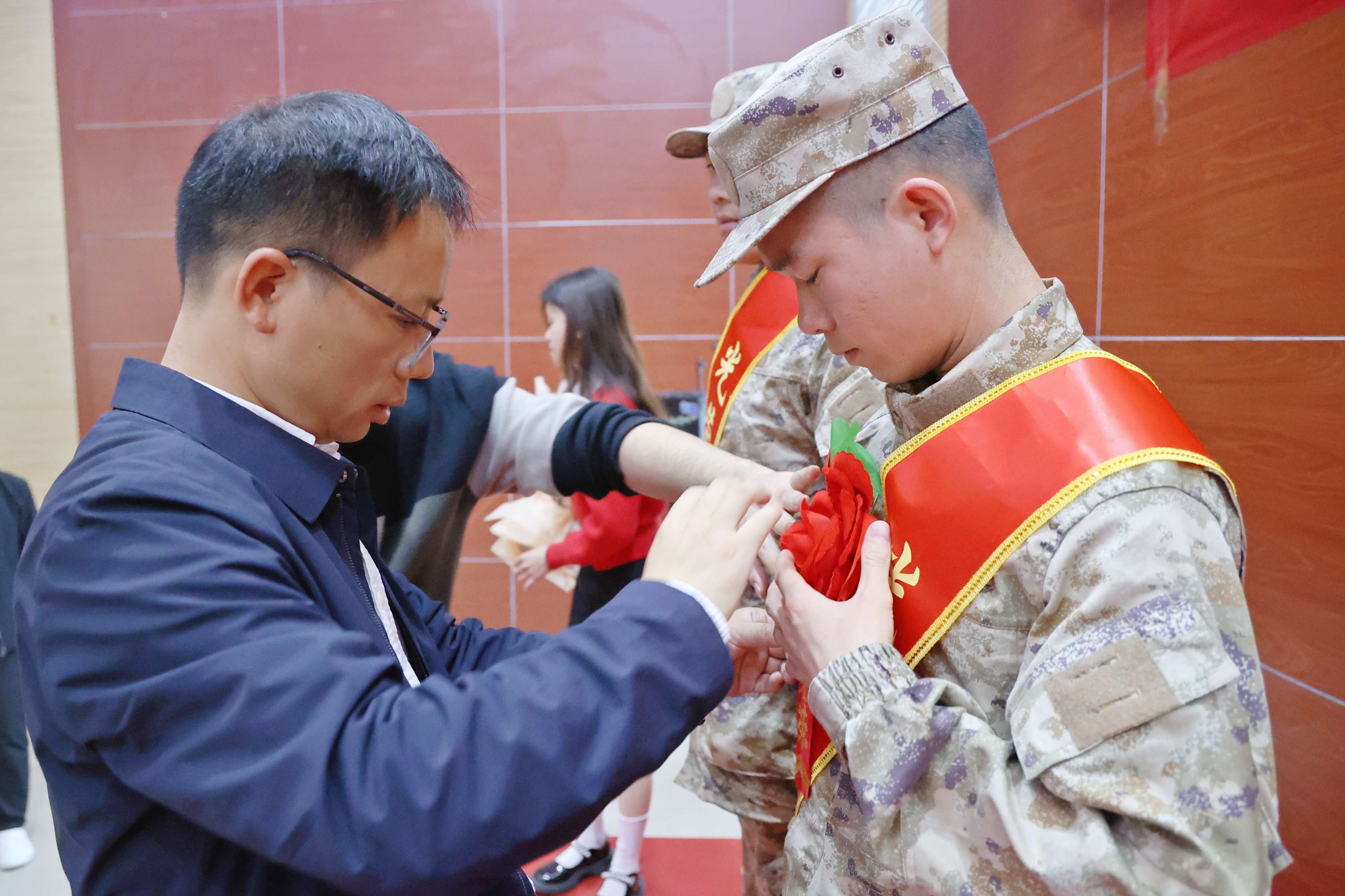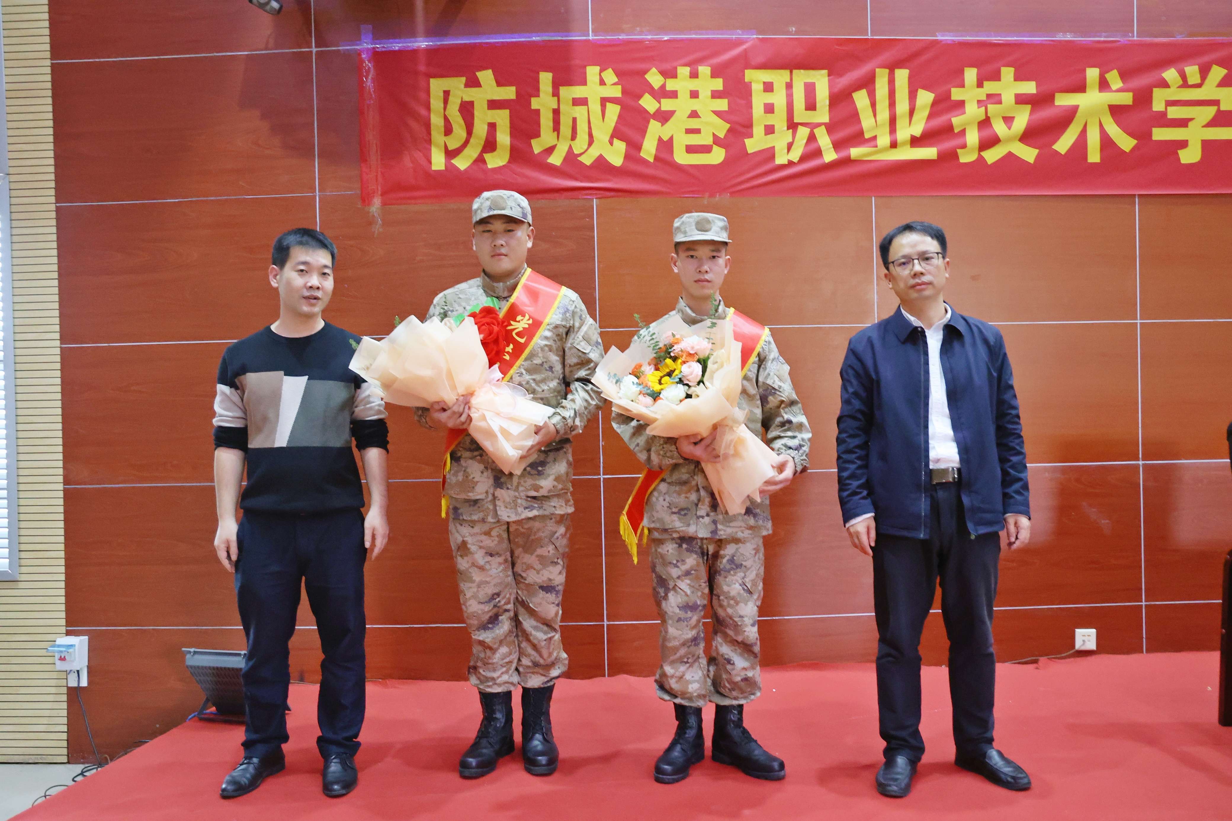 会后,学院党委副书记、院长欧阳群东向应征入伍学生系大红花、赠送鲜花并合影留念。
