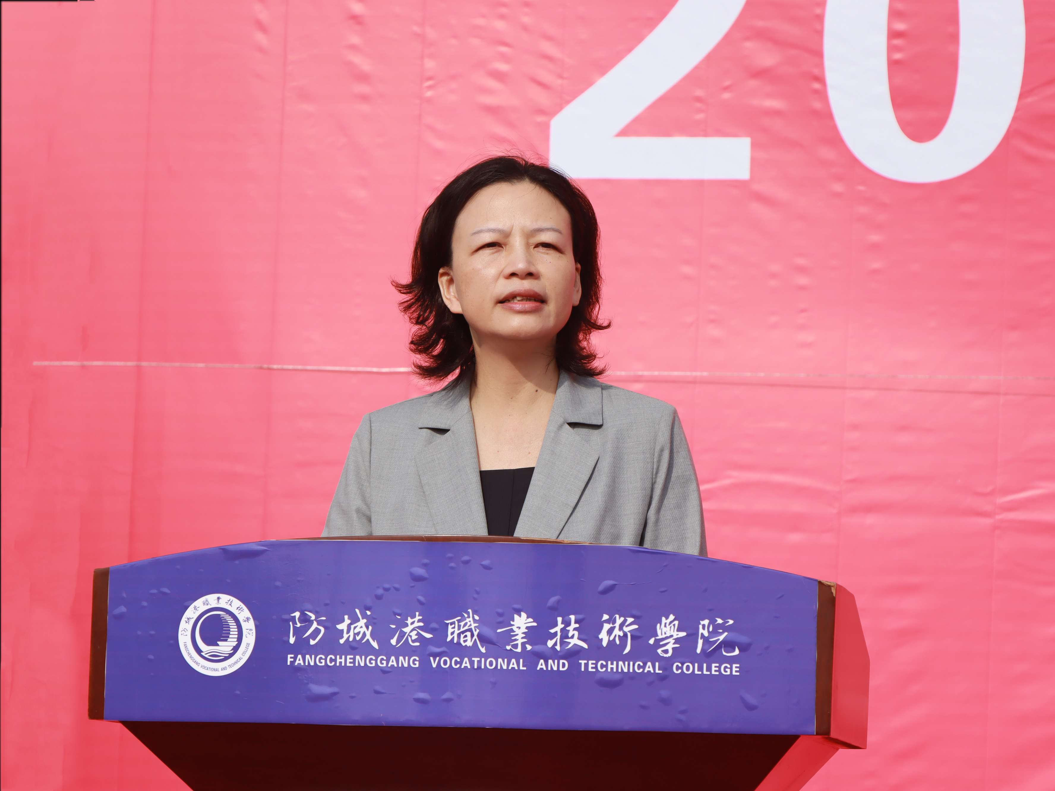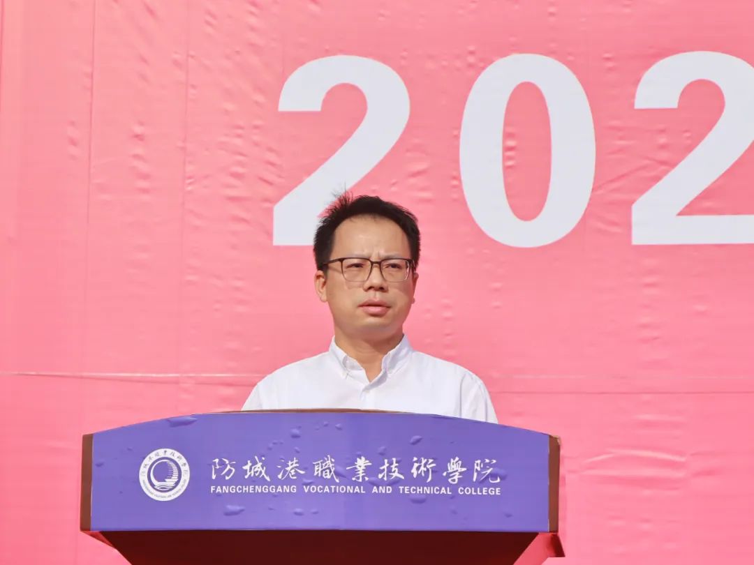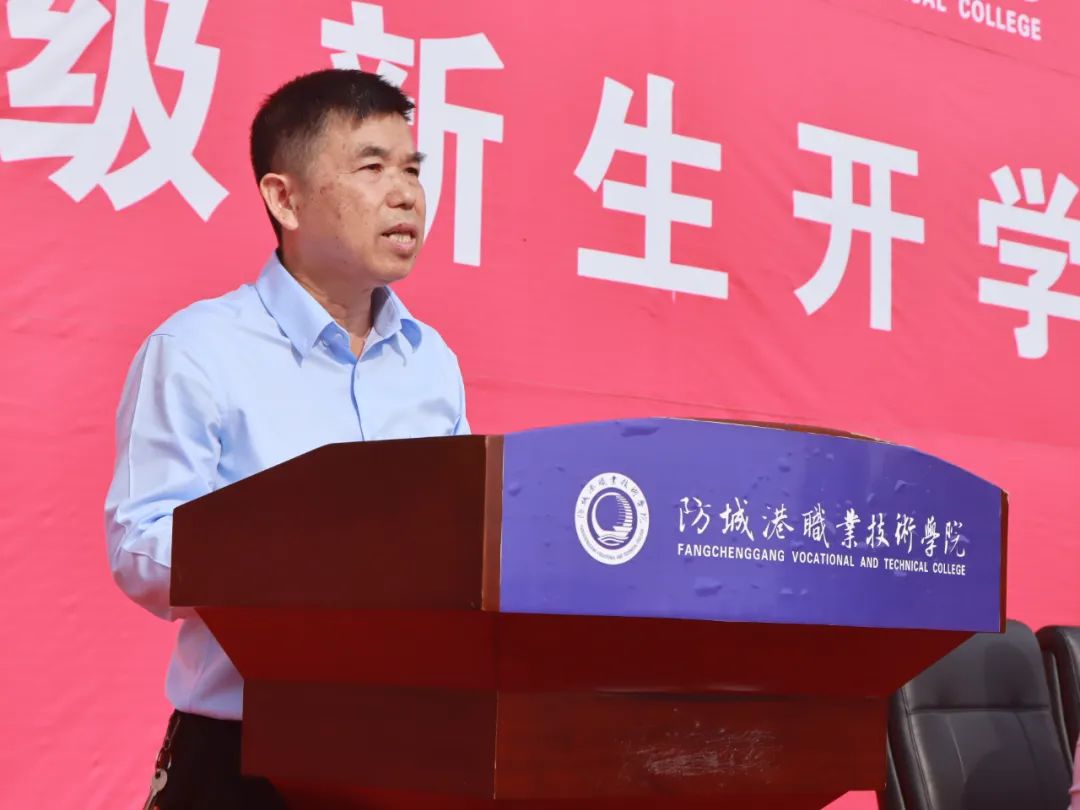 防城港市政协副主席、校党委书记陆健文,校长欧阳群东,防城港市教育局党组成员、副局长张培中,我校党委副书记刘志韬,副校长刘兵权,纪委书记刘振兴,广西盛隆冶金有限公司党委副书记、人力资源部副部长李利雄出席开学典礼。典礼由校长欧阳群东主持。