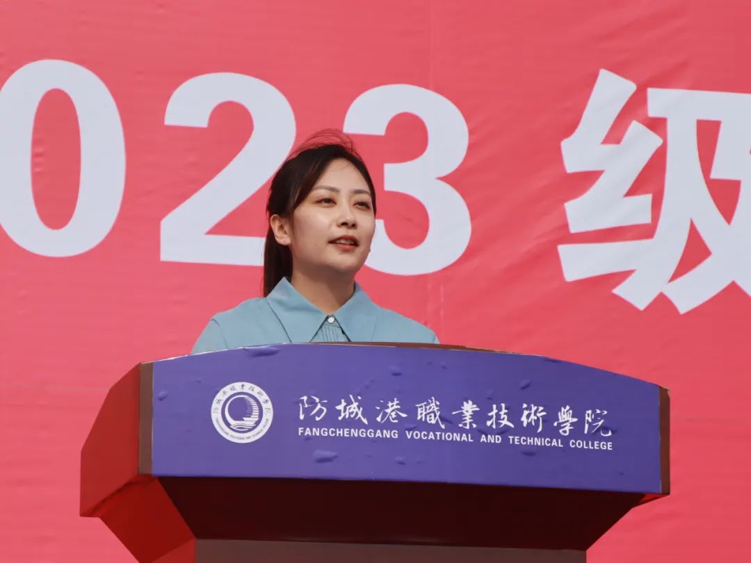 校党委书记陆健文以《逐梦闪光人生,不负青春韶华》为题,给新生们讲授“开学第一课”。她首先对新同学的到来表示热烈的祝贺和欢迎,并简要介绍了防城港市的区位优势和学校的办学特色。她指出,党的二十大擘画了全面建设社会主义现代化国家、以中国式现代化全面推进中华民族伟大复兴的宏伟蓝图,广大青年大学生生逢其时、重任在肩,要牢记习近平总书记的敦敦教诲,以奋斗姿态激扬青春,在防城港开发开放的热土上,挥洒青春之墨,书写精彩华章。