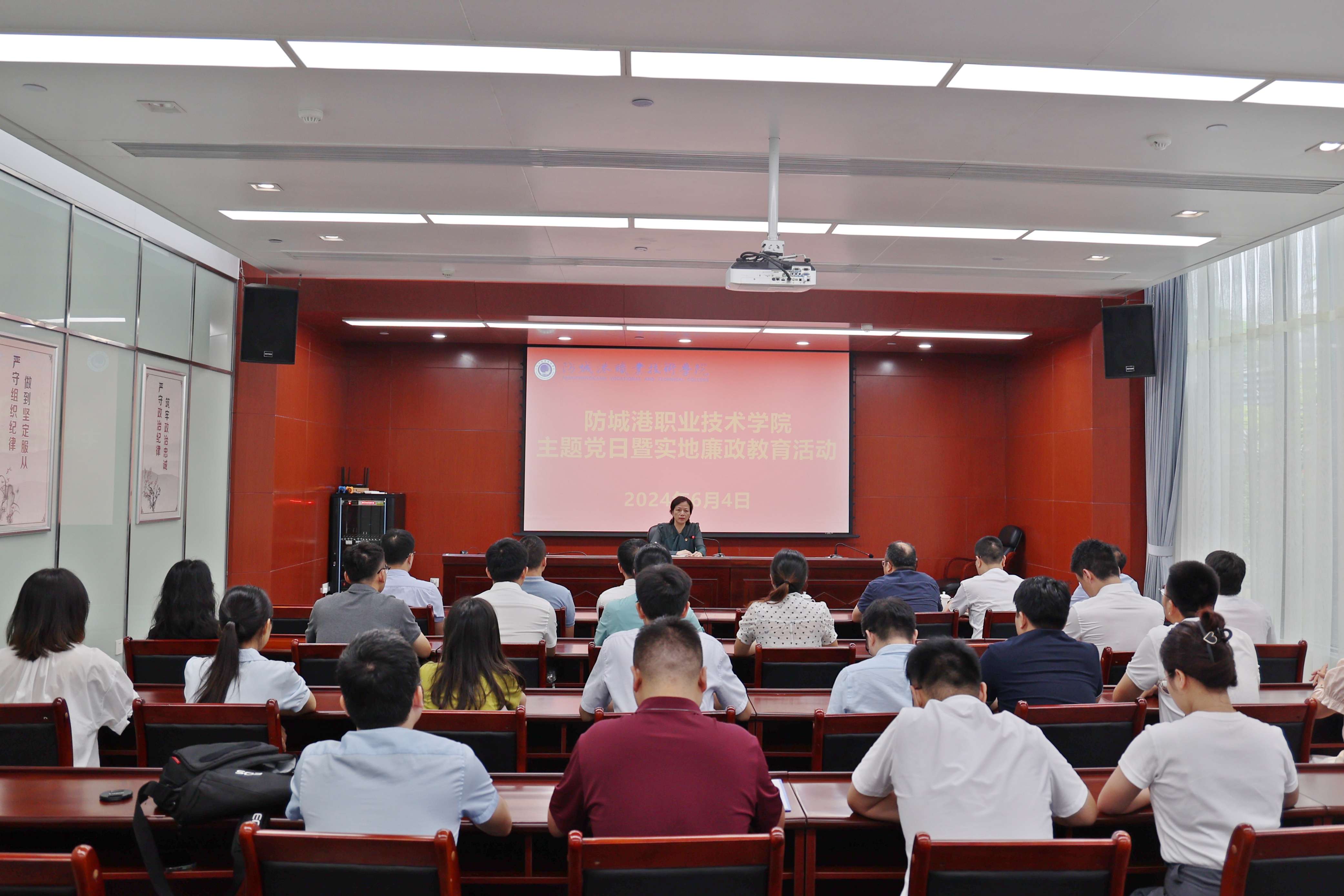 防城港职业技术学院领导班子成员和支部委员一行30余人认真聆听讲解员对中国共产党反腐倡廉历史和新时代反腐斗争取得的成果解说,重温党的纪律建设、廉政建设、作风建设等要求,并集中观看《严明政治纪律》警示教育片。