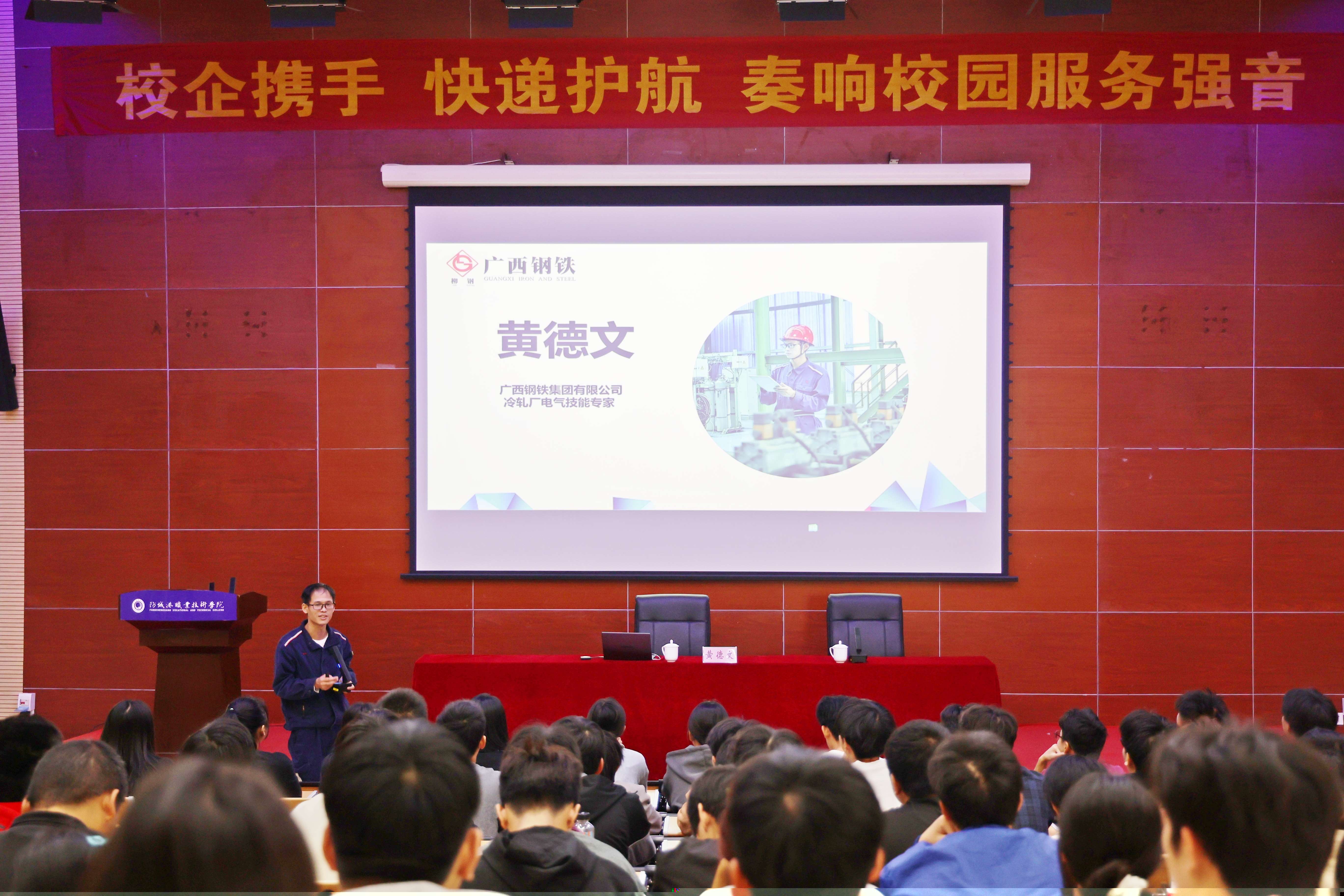 11月7日,“劳模工匠进学校”系列“大思政课”活动在我校图书馆报告厅举行。此次宣讲活动邀请了广西钢铁集团有限公司电气技能专家黄德文作为主讲嘉宾,旨在通过真人典型案例分享,传递劳模工匠精神,激发青年学生的奋斗热情和创新活力。活动由智能制造与信息工程学院蒙祖恩老师主持。