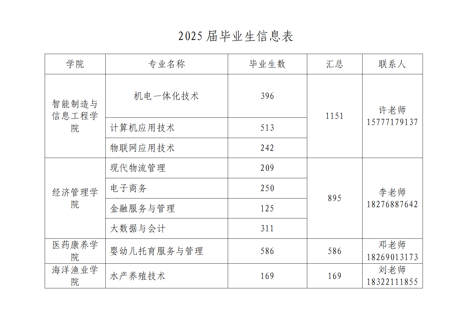 机电一体化技术、计算机应用技术、物联网应用技术、现代物流管理、电子商务、金融服务与管理、大数据与会计、婴幼儿托育服务与管理、水产养殖技术共9个专业。