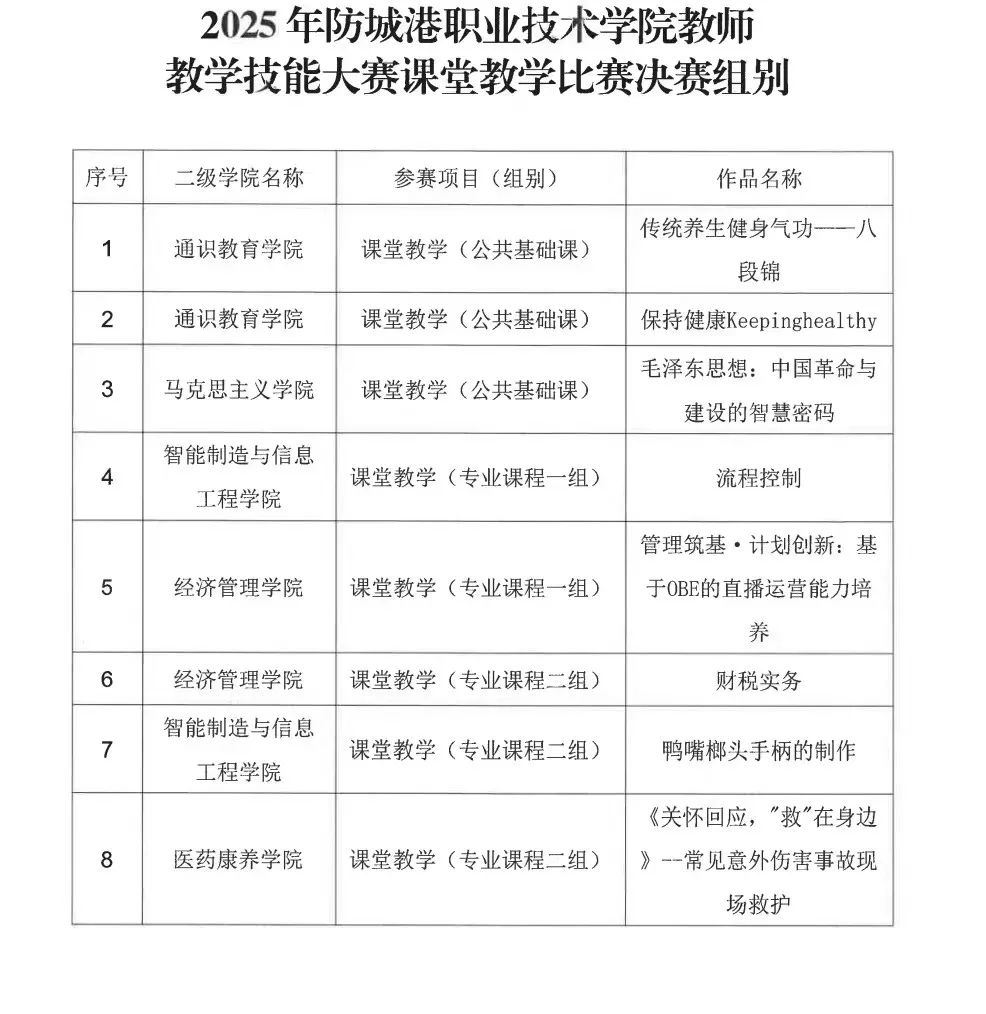 为深入推动新时代教师队伍建设,加快教育教学改革步伐,全方位提升育人水平, 3 月 25 日至 4 月 25 日,教务科研处举办了 2025 年防城港职业技术学院教师教学技能大赛(课堂教学比赛)。此次大赛吸引了众多参赛队伍参与,经过激烈的初赛选拔,最终 8 个优秀团队脱颖而出,成功闯入决赛。