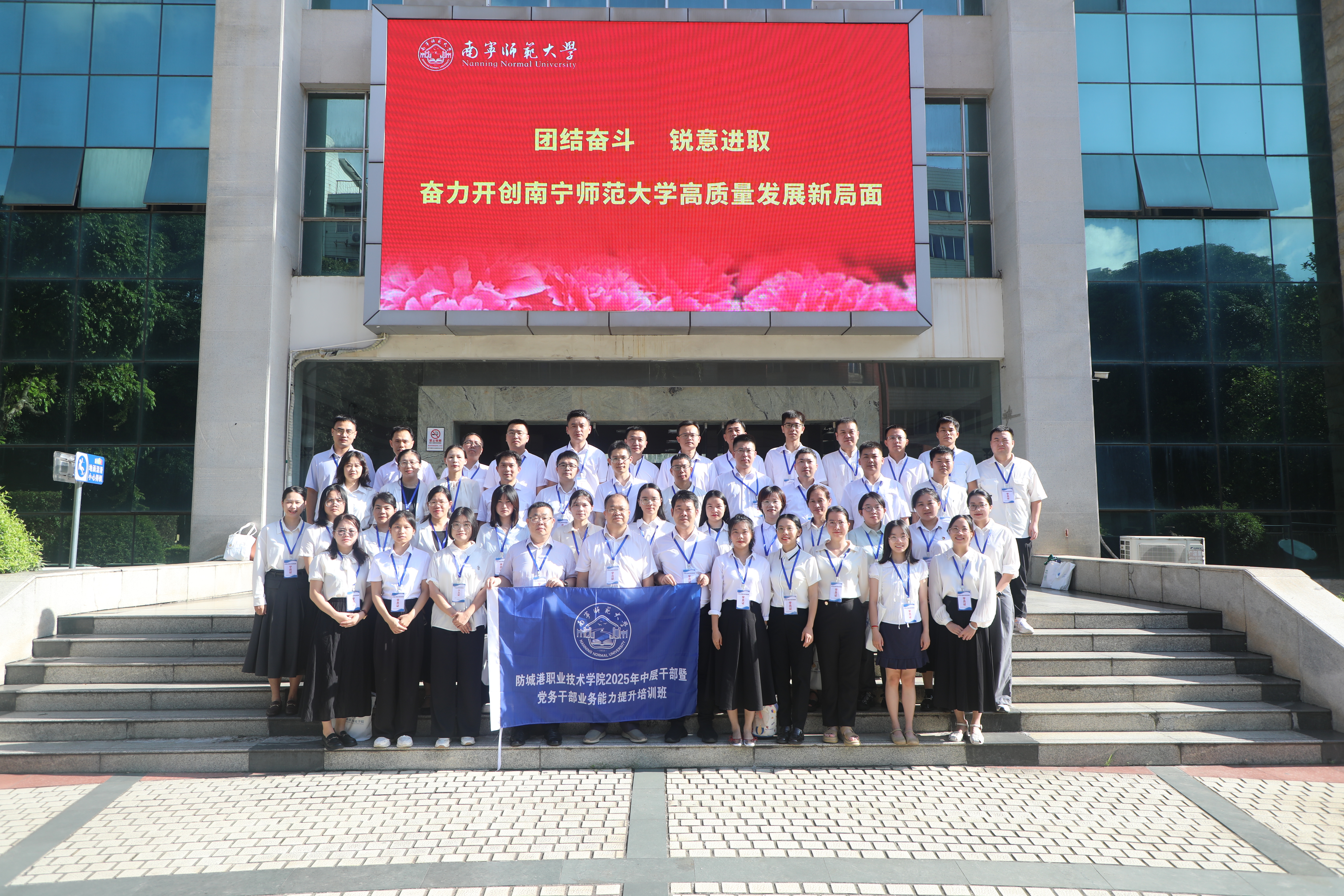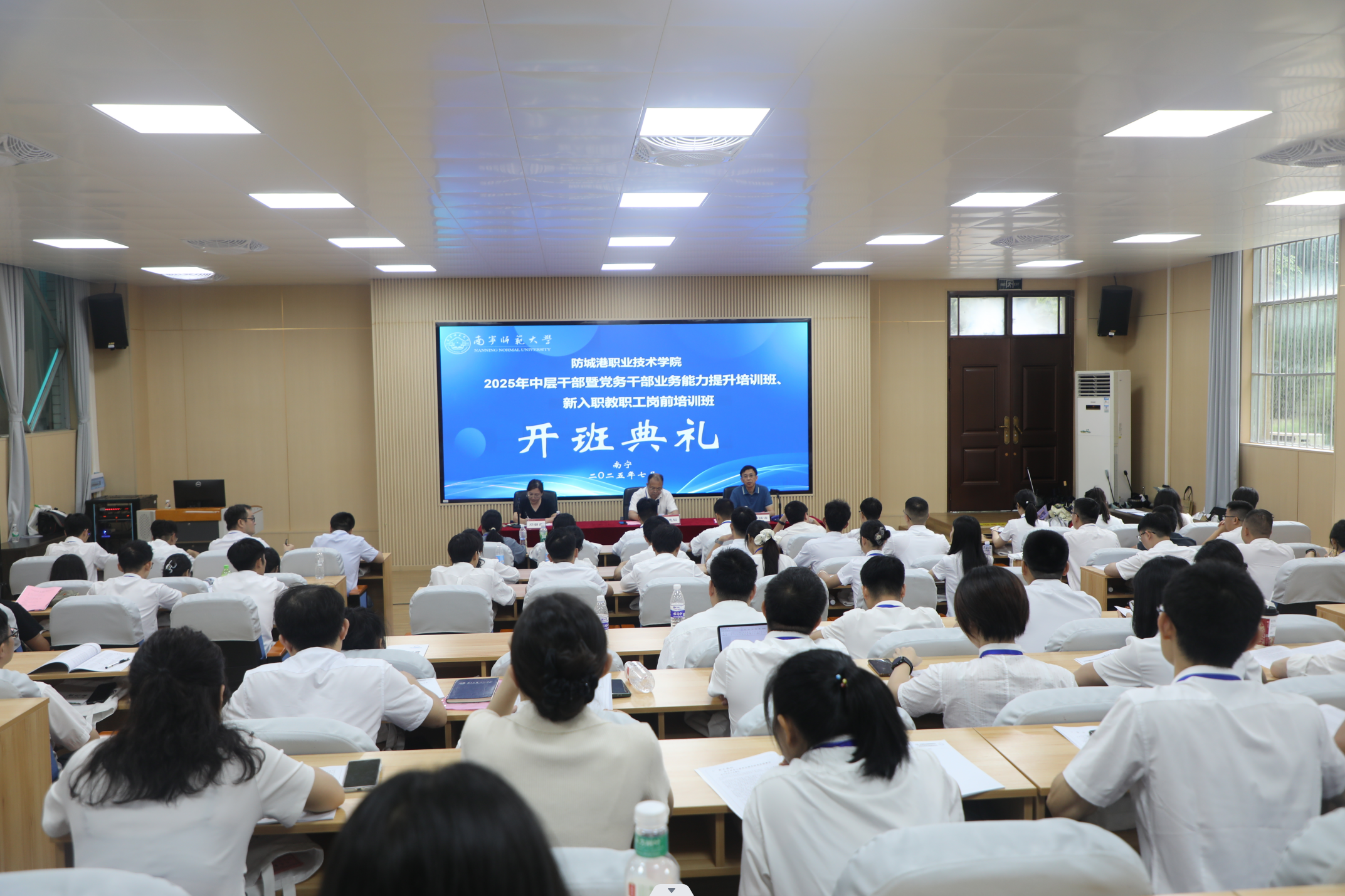 近日,我校2025年中层干部、党务干部业务能力提升暨新入职教职工岗前培训班在南宁师范大学开班。校党委副书记刘志韬、南宁师范大学职业技术师范学院副院长唐锡海出席仪式并致辞。学校中层干部、党务干部、新入职教职工共92人参加了开班仪式。