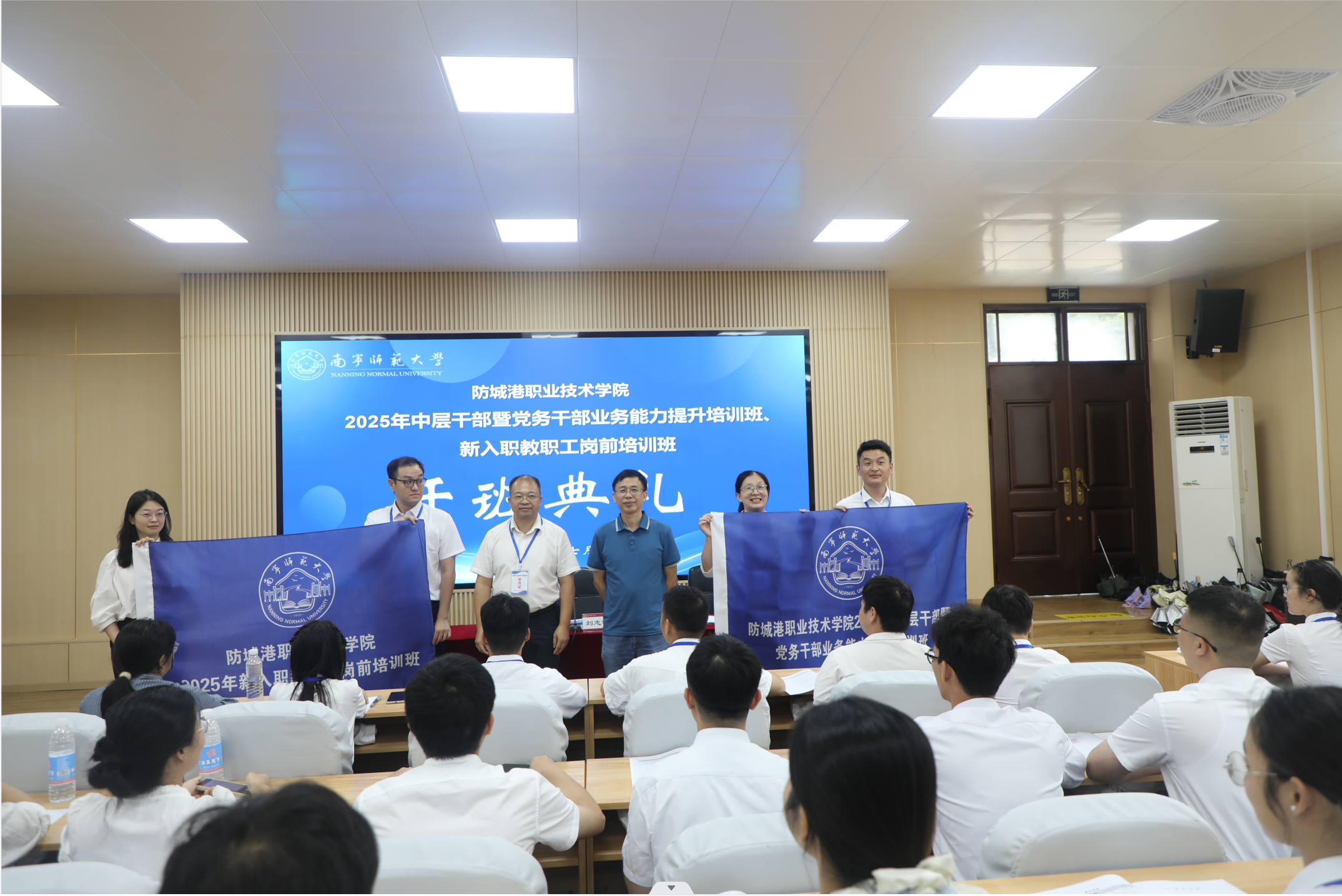 开班仪式上,刘志韬、唐锡海共同为两个培训班授旗。新入职教师代表林崇任分享了自己对教师职业的理解与体会。全体新进教职工进行庄严宣誓,立志为教育发展、国家繁荣和民族振兴努力奋斗。