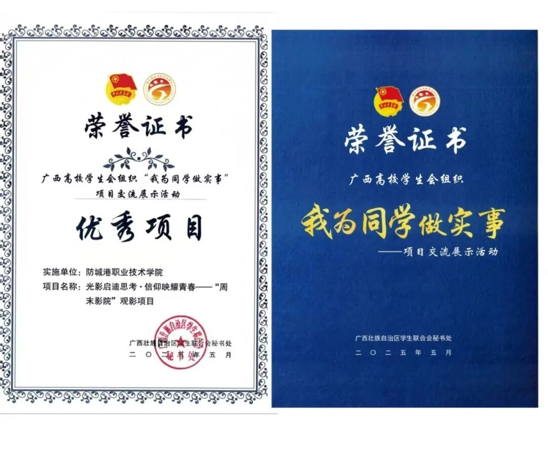 2025年全区高校学生会组织“我为同学做实事”项目交流展示活动结果正式公布,经现场展示、答辩评审等多环节严格遴选,由校团委指导、校学生会组织实施的 “光影启迪思考・信仰映耀青春 ——‘周末影院’观影项目” 凭借鲜明的主题定位、扎实的服务成效获得认可,获评为 “优秀项目”,为学校赢得了荣誉,也为我校学生组织服务工作写下亮眼一笔。