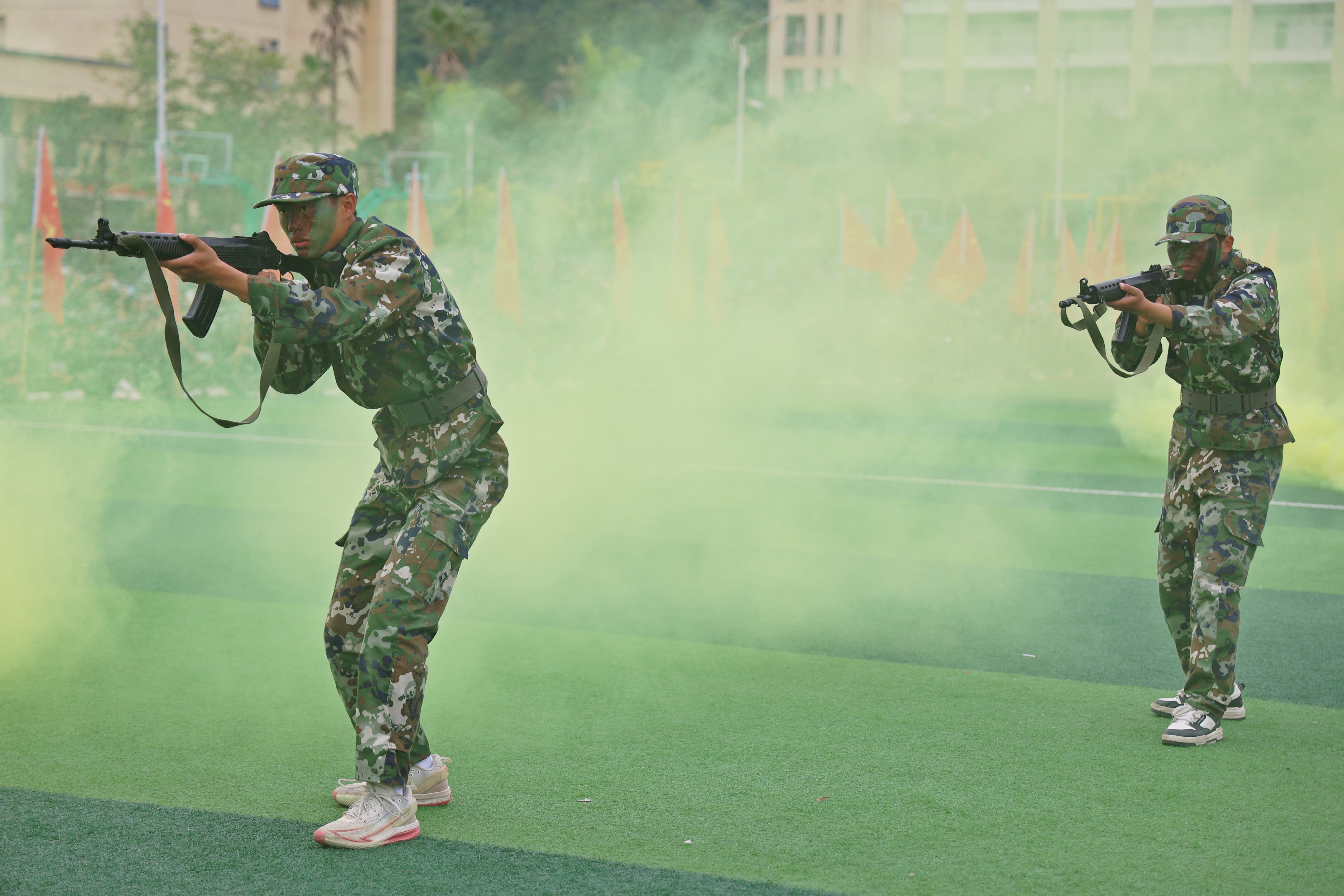 各方阵依次通过主席台接受检阅:分列式方队步伐整齐、口号铿锵;捕俘拳与捕俘刀表演刚劲有力、气势昂扬;战术演练配合默契、动作规范,全面展现了2025级学生经过军事训练后良好的精神风貌与训练成果。