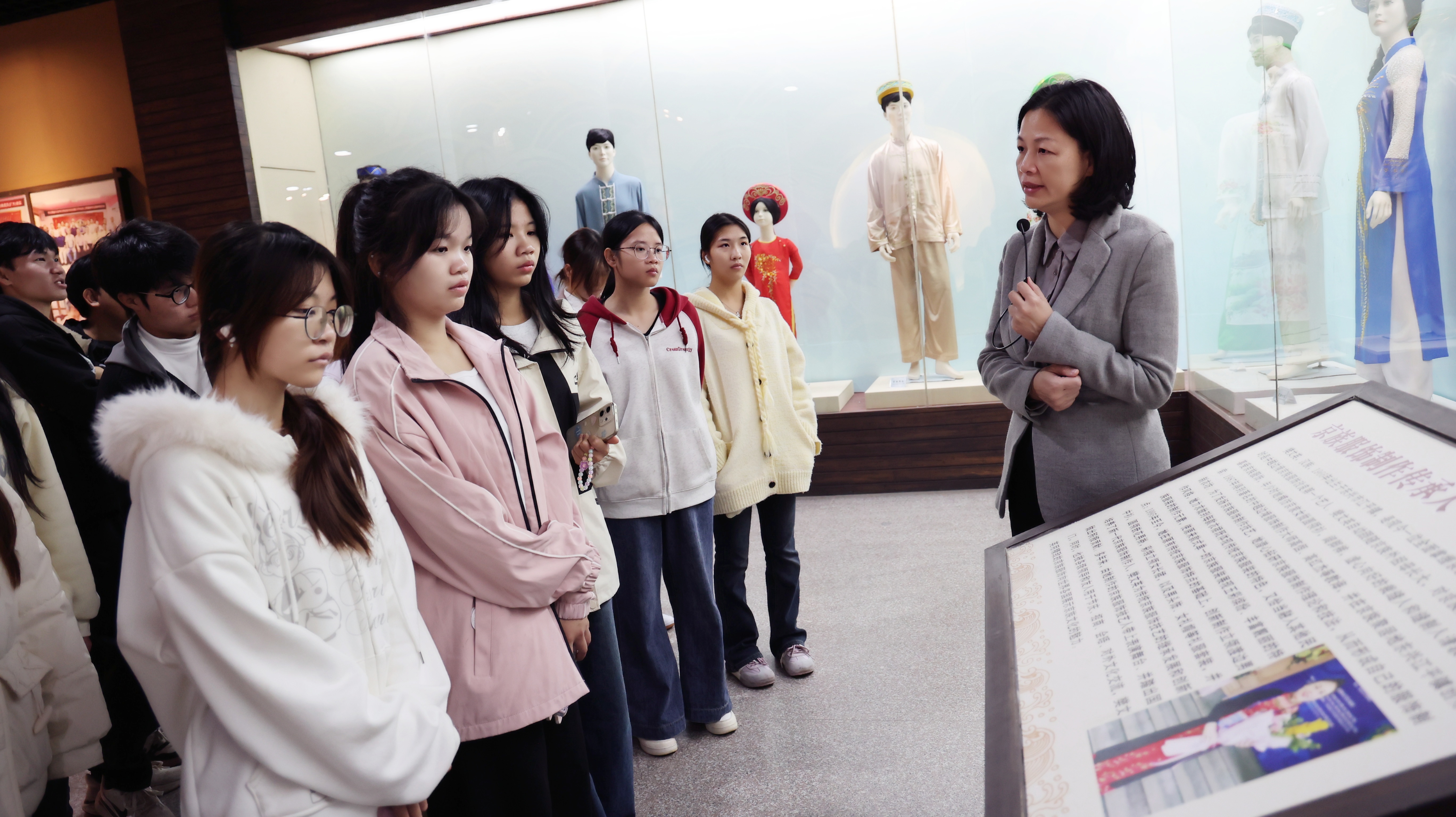 在江平镇万尾村,师生走进京族博物馆。在讲解员的引导下,师生共同领略我国唯一海洋少数民族——京族的独特文化,从哈节的庆典习俗到独弦琴的悠扬乐声,展现了京族文化在保护中传承、在交融中发展的生机与活力。陆健文以“‘弦’动同心——在文化交融中培育共同精神与守望相助的家园认同”为题,向学生介绍当地特色民宿、海鲜餐饮与京族风情相互融合的景象,讲述各民族群众通婚联姻、节庆共享、生产互助的温馨故事,强调文化认同是最深层次的认同。万尾村各民族文化的互鉴共荣、邻里间的守望相助,正是构筑中华民族共有精神家园、凝聚民族团结力量的鲜活写照。