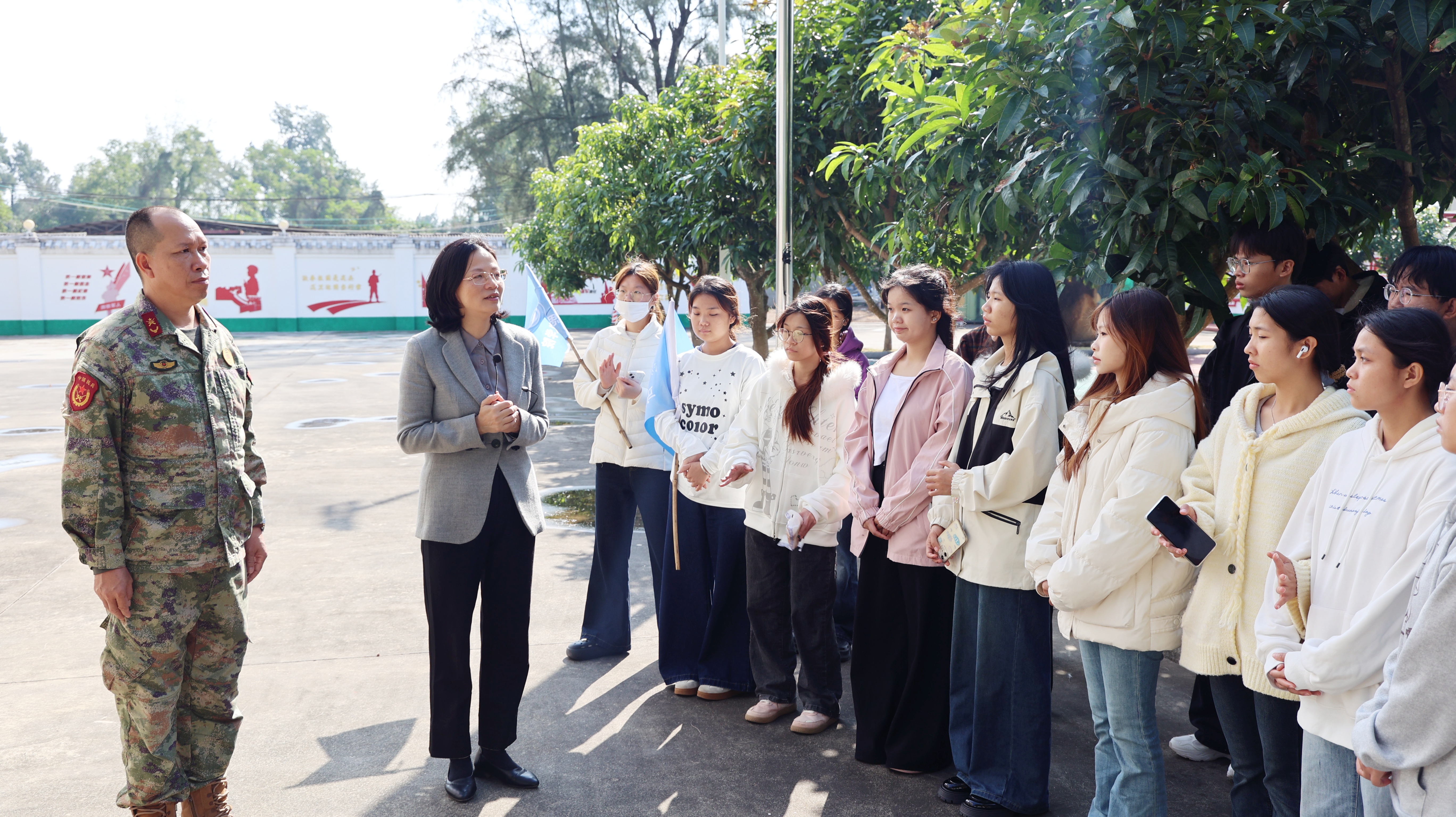 在万尾哨所,“最美拥军人物”、哨所所长刘华强为师生介绍哨所巡边守疆的职责与功能,带领师生参观哨所面貌、防浪堤及荣誉室,讲述一代代戍边官兵与当地京族、汉族群众军民团结、共守海疆、互助友爱的感人历程。陆健文以“‘哨’望家国”为主题,阐述军民同心、共卫边疆的事迹,指出万尾哨所与边民群众的实践是建设稳定边疆、守护家园的缩影。她强调,国家安全是各族人民幸福生活的根本保障,铸牢中华民族共同体意识是维护国家统一和边疆巩固的思想长城,并勉励青年学子心系国防、牢记使命。