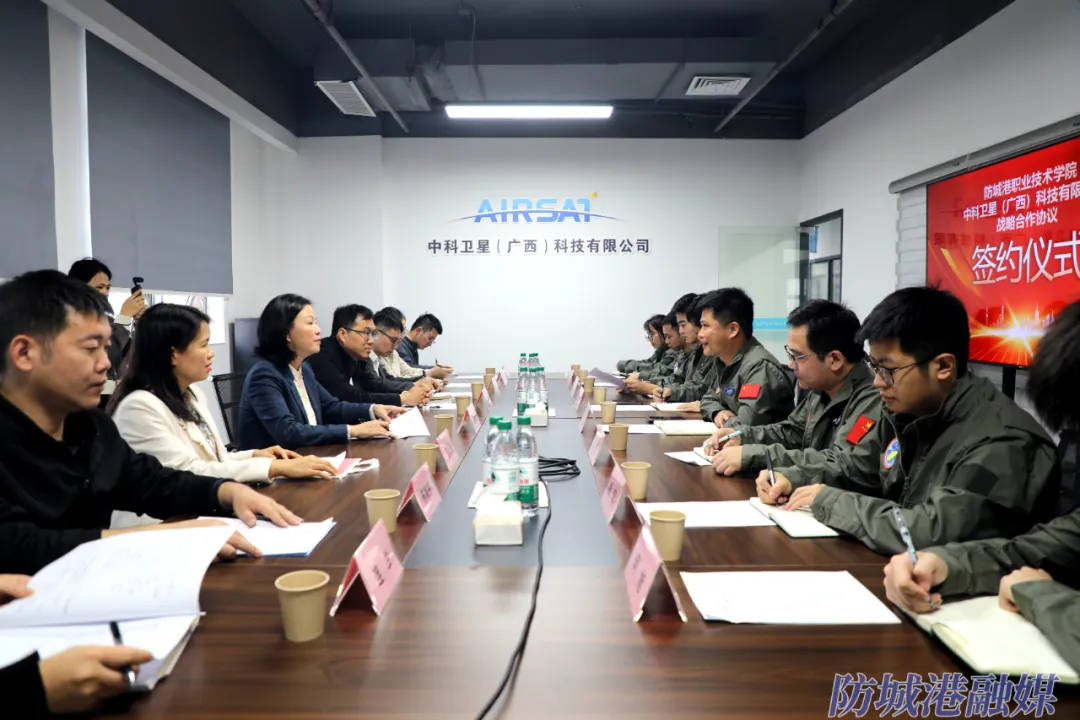 市政协副主席、防城港职业技术学院党委书记陆健文,中科卫星集团副总裁、中科卫星(广西)科技有限公司总经理张生青,以及双方师生、企业代表等出席签约仪式。