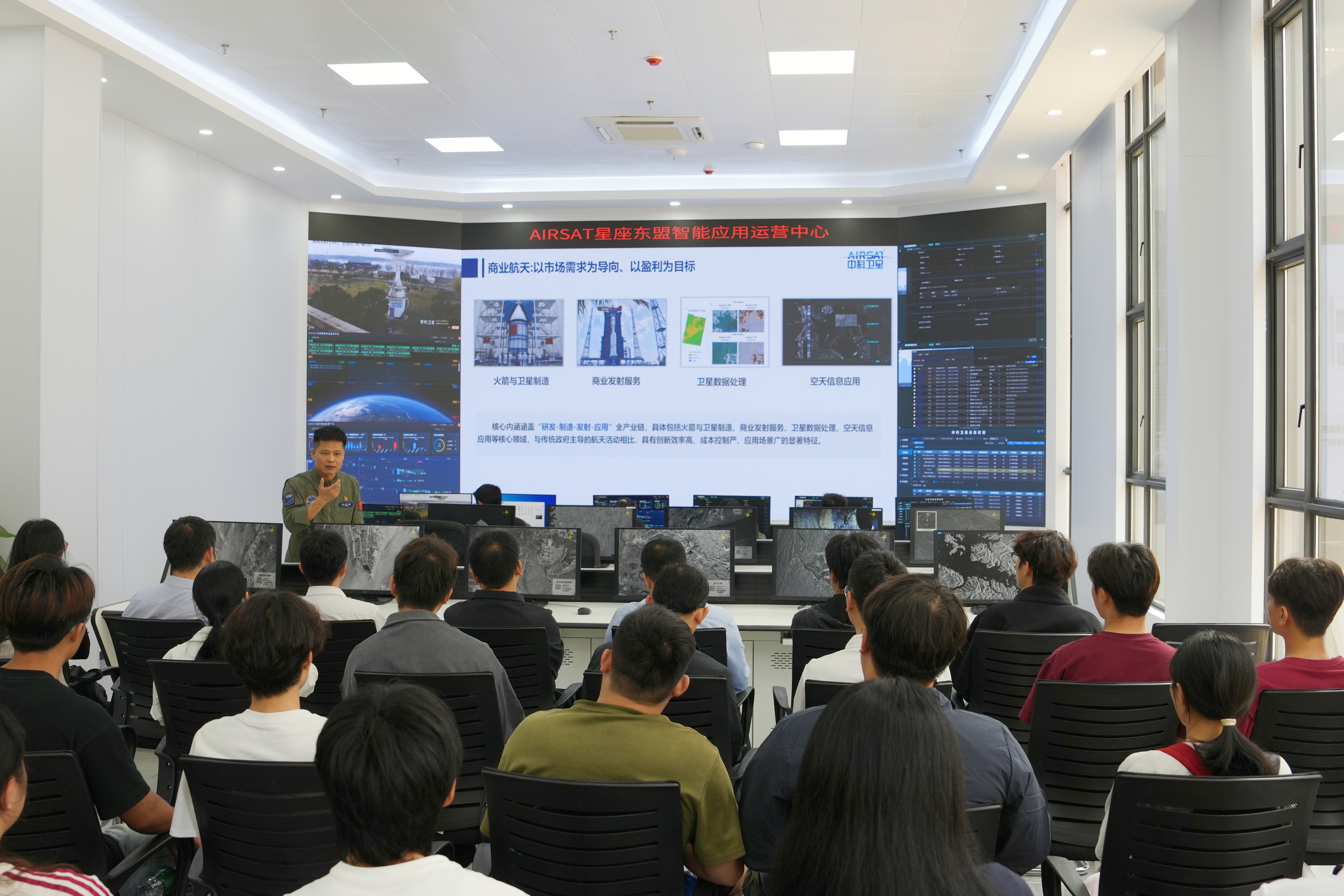 师生首先参观了中科卫星位于防城港市经开区的研发基地,实地考察企业在卫星科技、智能制造等领域的最新研发成果与应用场景。参观过程中,中科卫星科技集团有限公司副总裁张生青详细介绍了公司发展历程、核心技术布局及未来发展方向。师生认真聆听讲解,并与企业技术人员积极互动,现场气氛热烈。