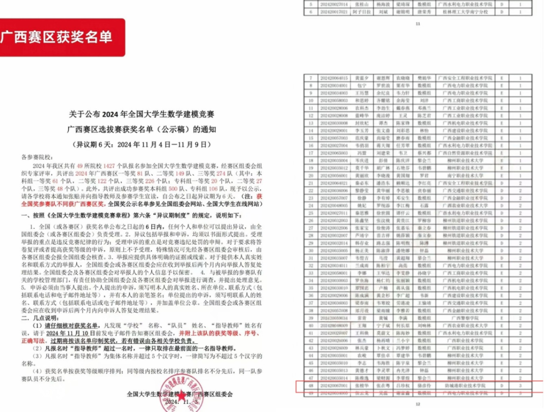 我校在2024年高教社杯全国大学生数学建模竞赛广西赛区选拔赛中荣获佳绩