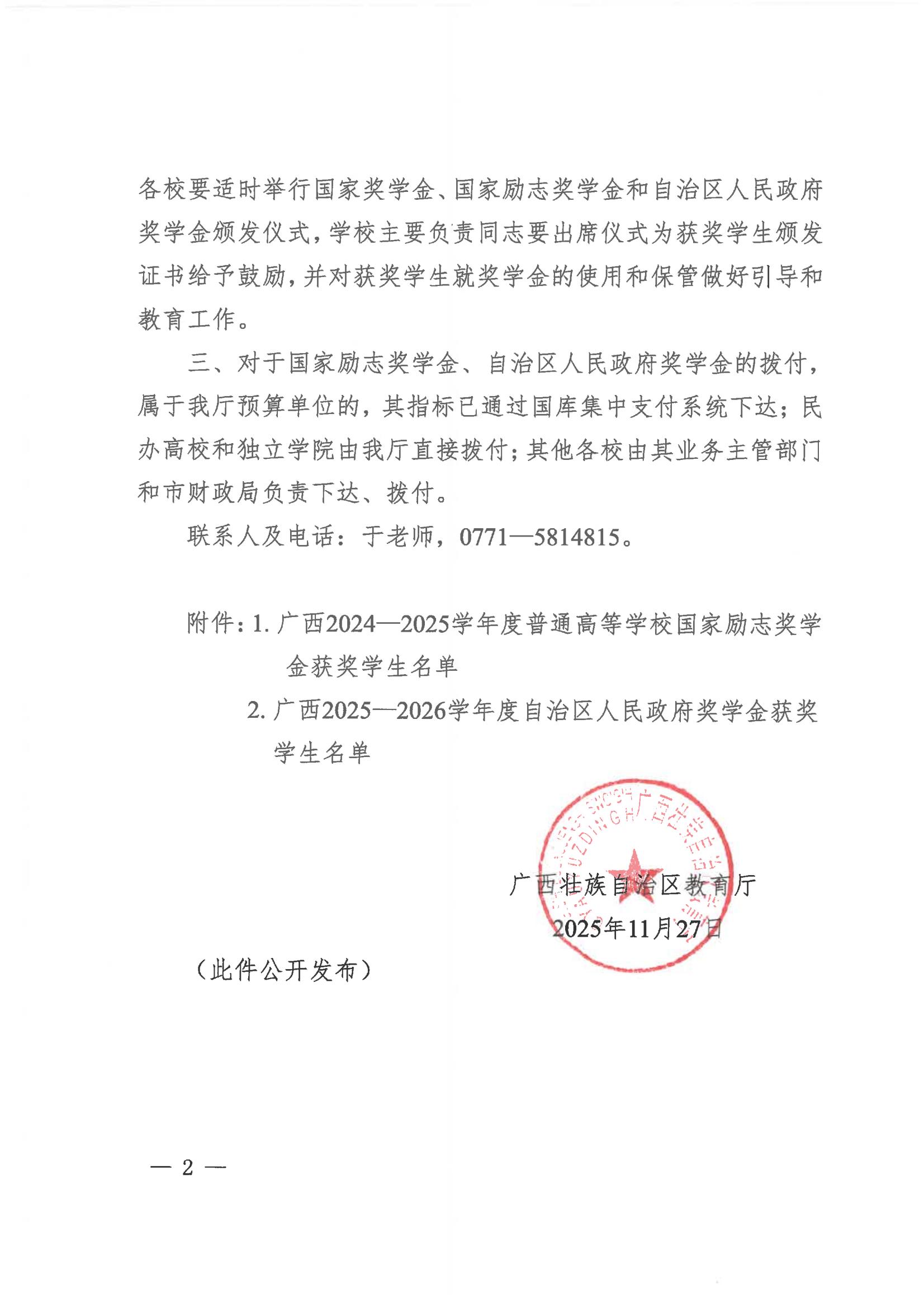 自治区教育厅关于公布2024—2025学年度普通高等学校国家励志奖学金和2025—2026学年度自治区人民政府奖学金获奖学生名单的通知