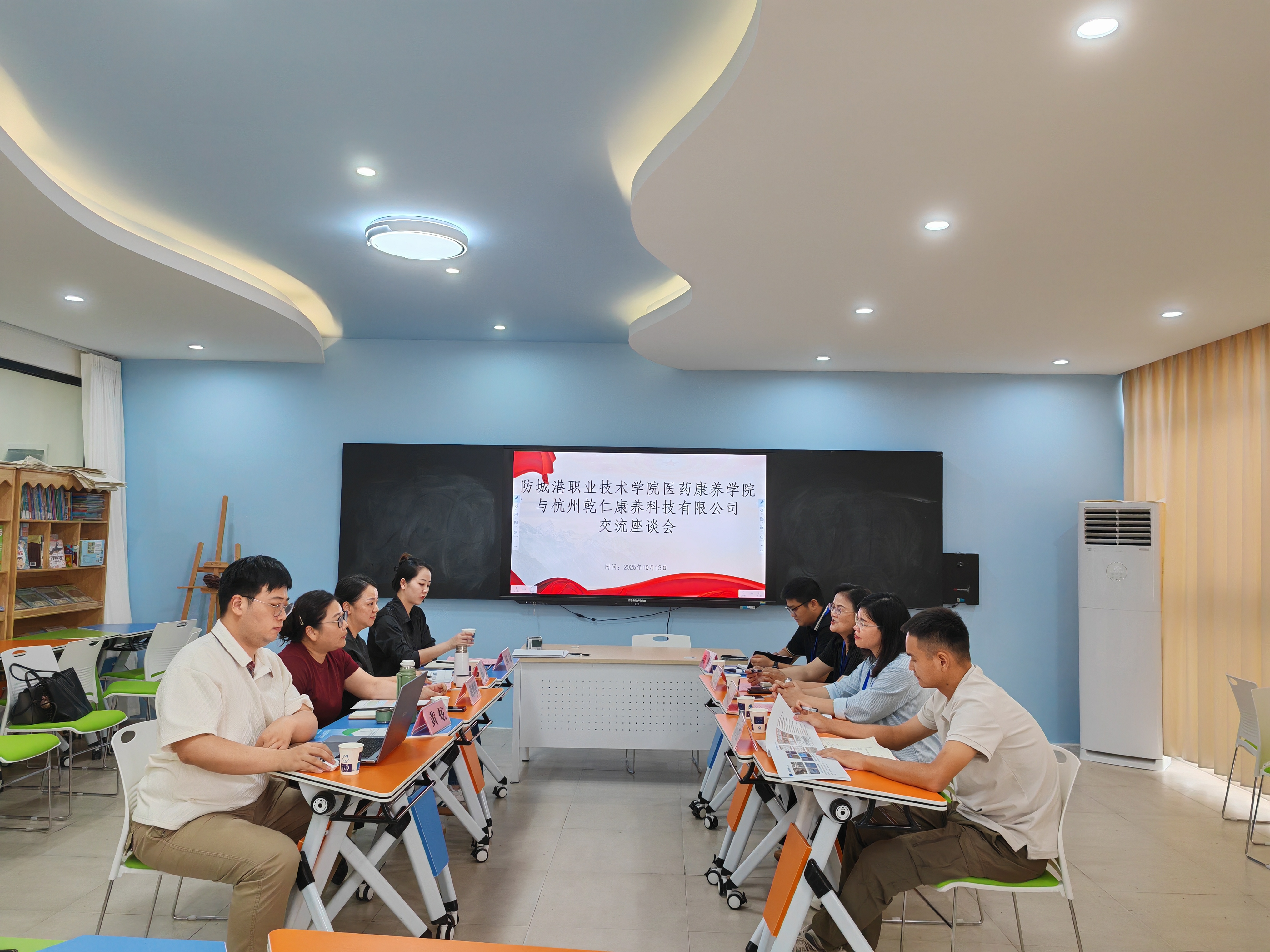 10月13日下午,防城港职业技术学院医药康养学院与杭州乾仁康养科技有限公司在学院行政楼209室召开交流座谈会。医药康养学院党支部书记连兰、特聘教授许慧红及专任教师杨小松、陈伟,以及杭州乾仁康养科技有限公司总经理杨芸、项目经理黄炫,北京佳莱康健康科技有限公司总经理蒋婵婵、浙江金潮教育集团广西公司副总经理周璇等参会。