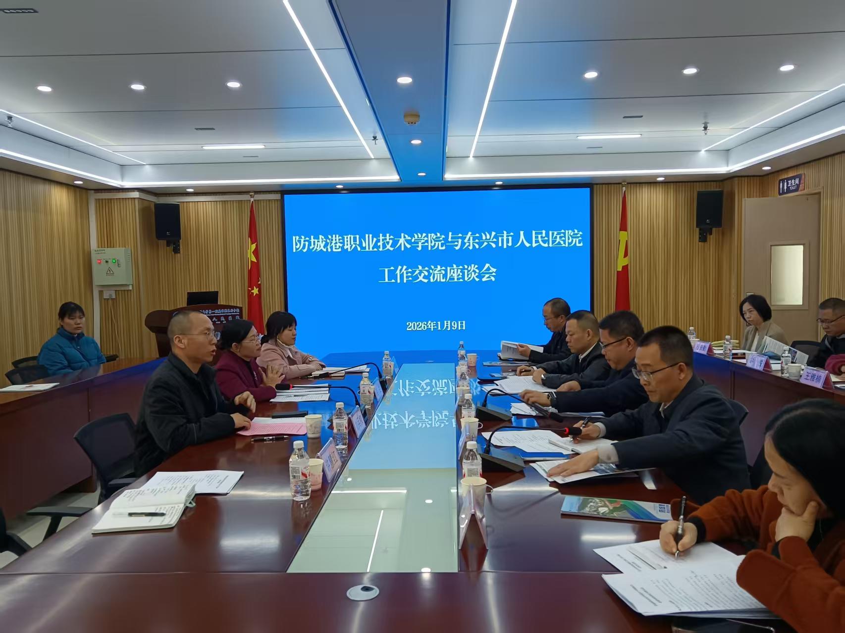 为深化产教融合、推进医教协同创新,夯实医药卫生类专业发展根基,2026 年 1 月 9 日,防城港职业技术学院副校长刘兵权带队,医药康养学院党支部书记连兰、特聘教授许慧红等一行赴东兴市人民医院,开展合作交流活动,双方围绕师资共享、科研项目等议题展开深入探讨,达成多项共识。