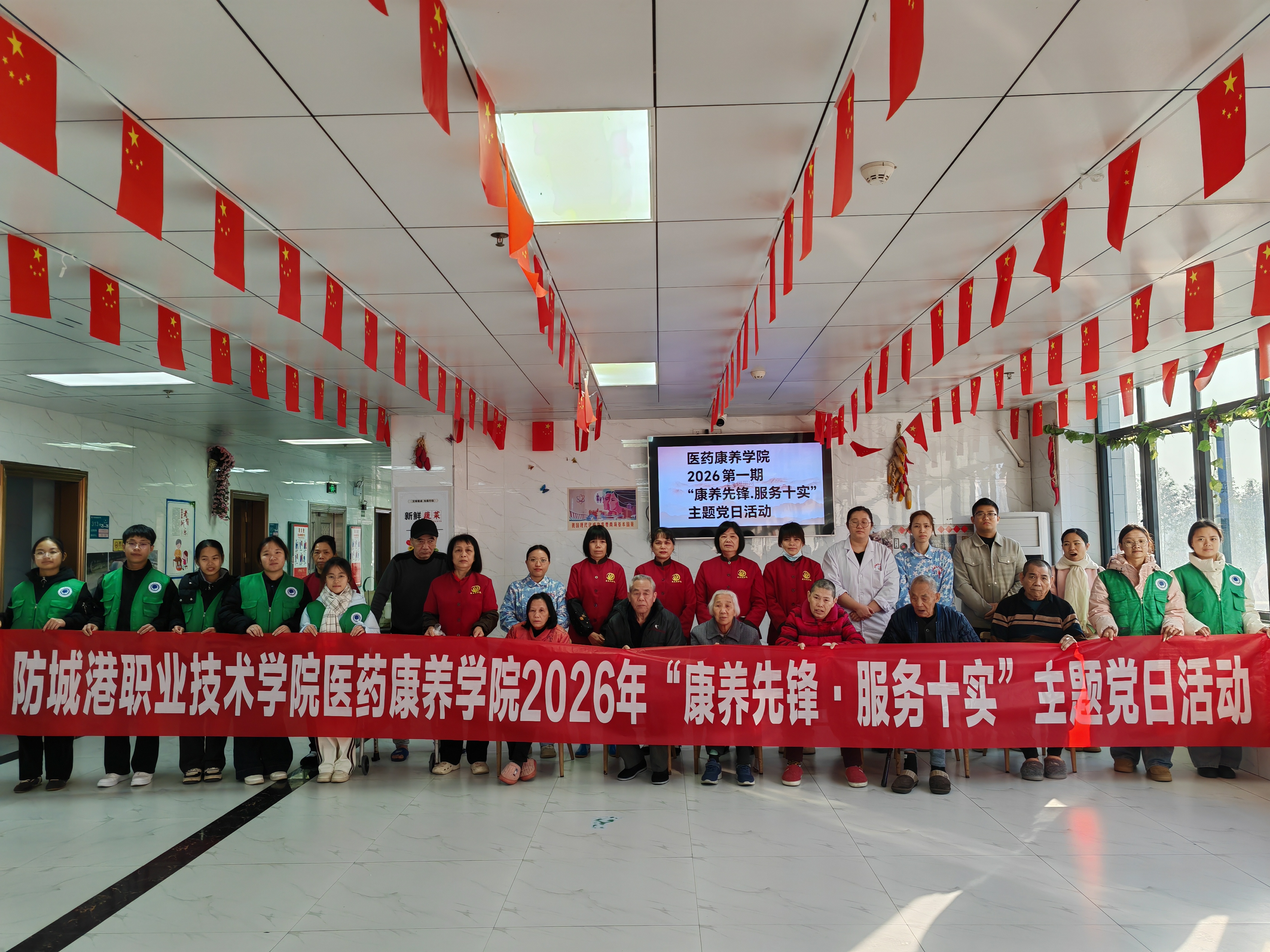 为深化党建引领作用,推动党建工作与康养服务深度融合,1 月 9 日,我校医药康养学院党支部组织师生志愿者赴防城港康晨养护院,开展2026年第一期 “康养先锋・服务十实”党团联动赋能活动,以实际行动践行爱老敬老传统美德,彰显高校服务社会的责任担当。