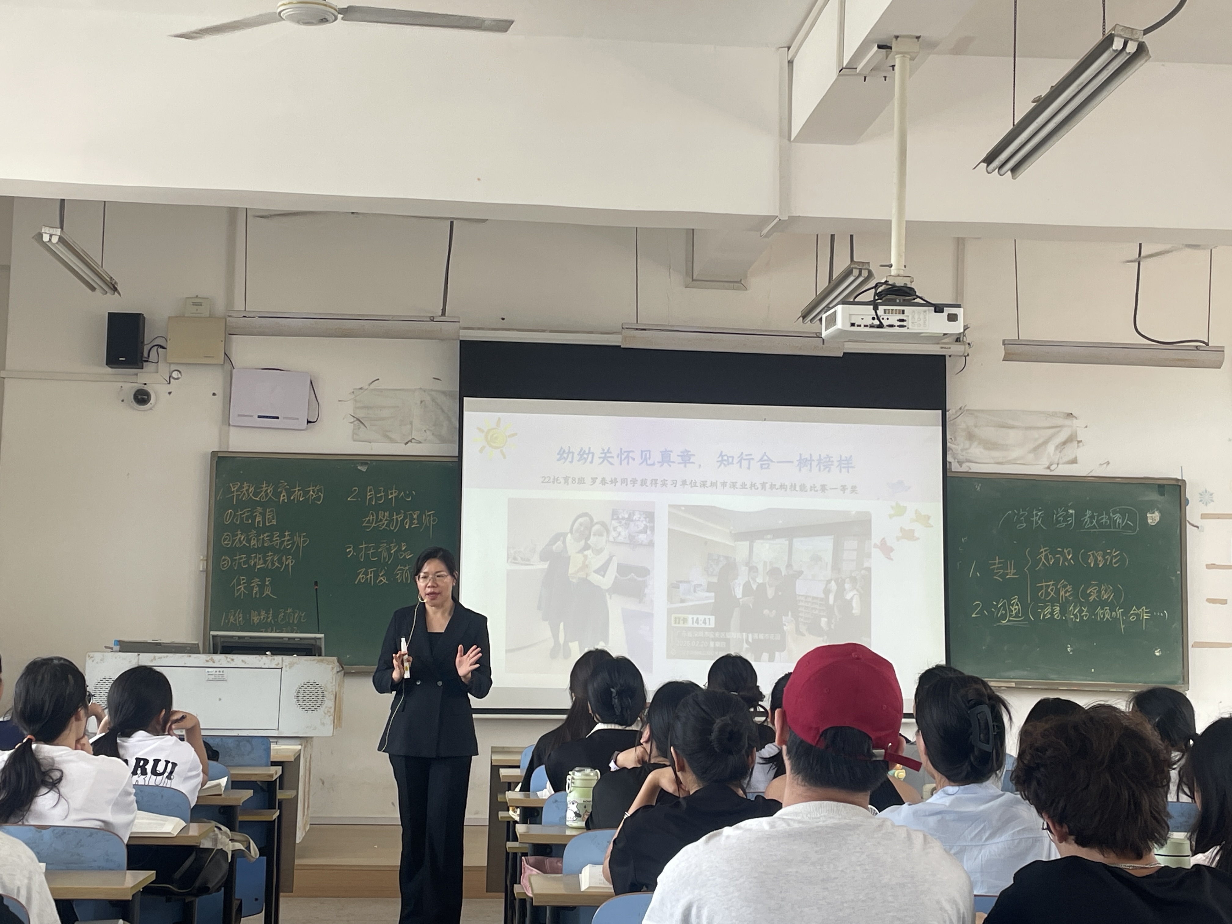 连兰书记围绕职业道德和职业精神两大核心内容进行深入讲解,旨在通过真实案例剖析和情景模拟,帮助学生树立正确的职业价值观,为未来的就业之路打下坚实基础。她分享了2022级托育8班罗春婷同学获得深圳市深业托育机构技能比赛一等奖的案例,用本校优秀学子事例为学生们树立知行合一的工作榜样和诠释了“服务社会”的职业精神内涵。