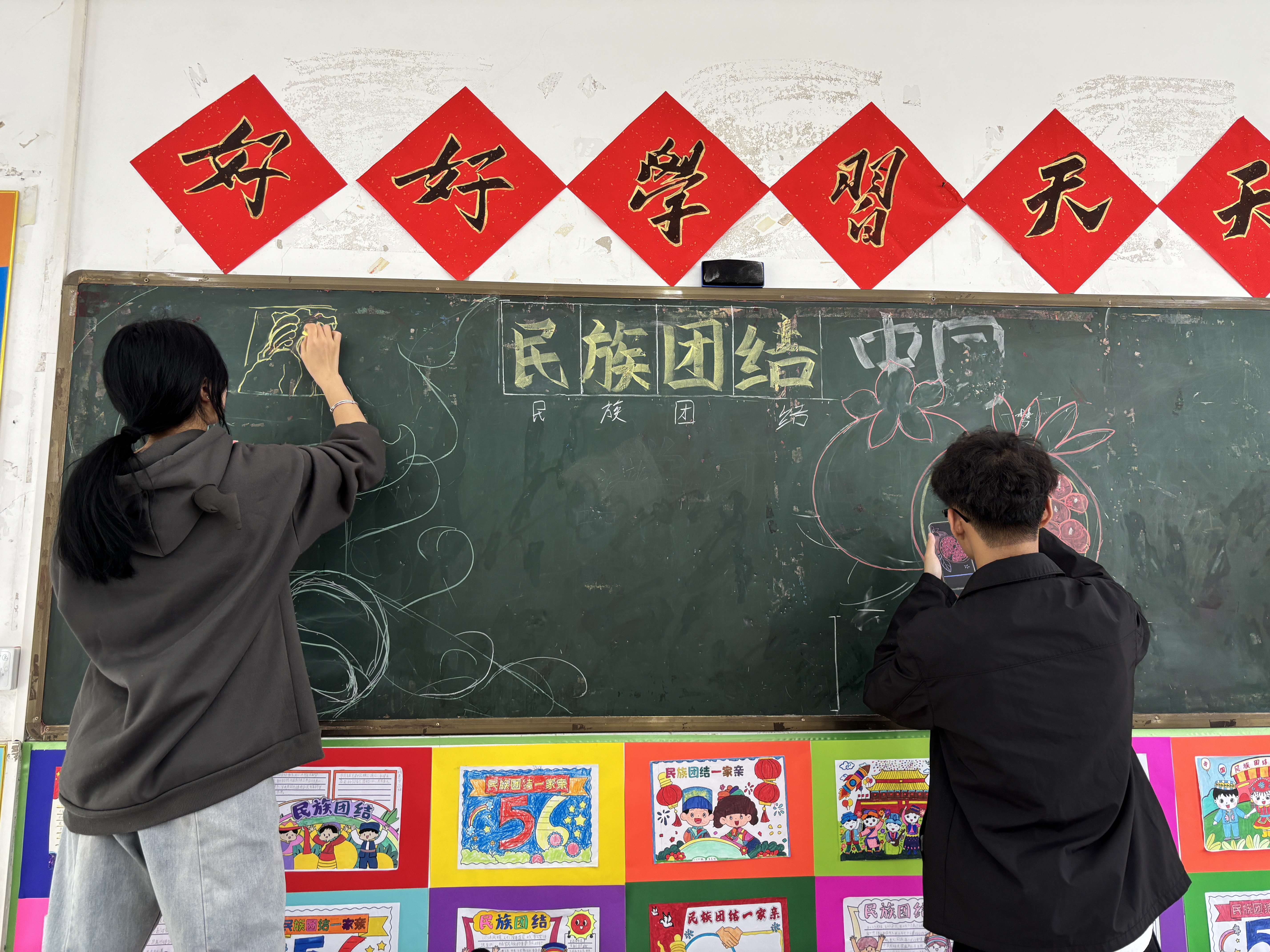 2025年4月13日上午,在海洋渔业学院谭围老师带领下,我校医药康养学院六名同学来到防城港市第四中学小学部一年级三班开展了以“民族团结一家亲”为主题的黑板报设计实践活动。