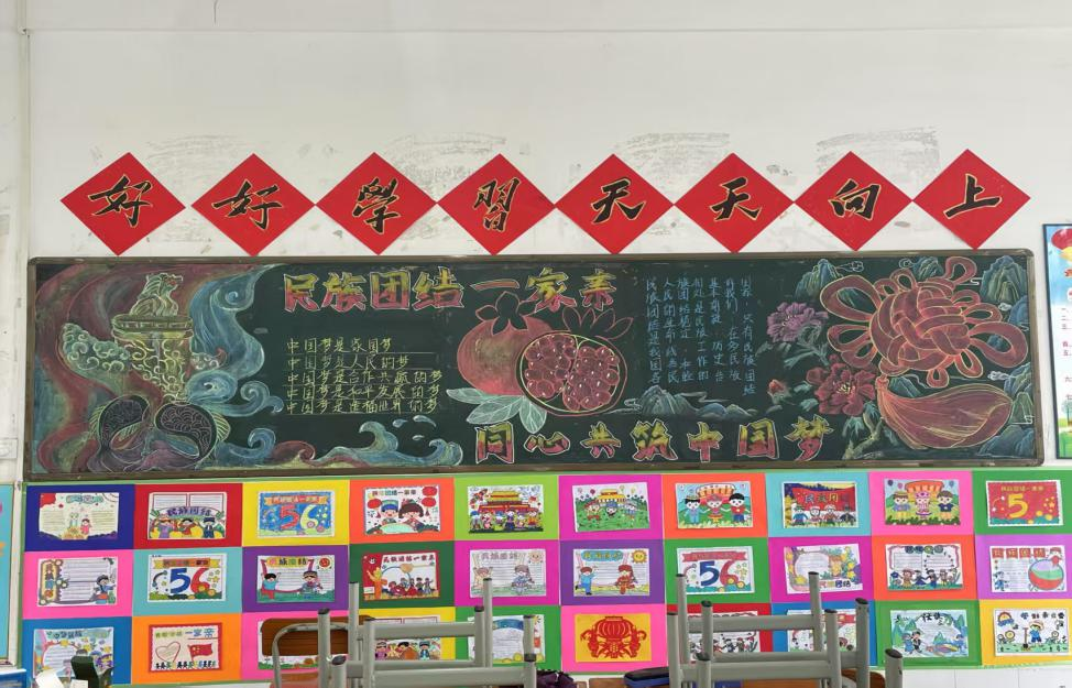 此次活动,我校六名同学分工明确,充分发挥自己的绘画和设计特长。同学们将民族团结的创意倾注笔端——绽开的石榴露出晶莹饱满的籽粒,青铜华表纹样勾勒出历史厚重感,彩绘祥云串联起整个版面。当粉笔末簌簌落下时,黑板报上每一处细节都在诉说:56个民族正如这石榴籽般密不可分。