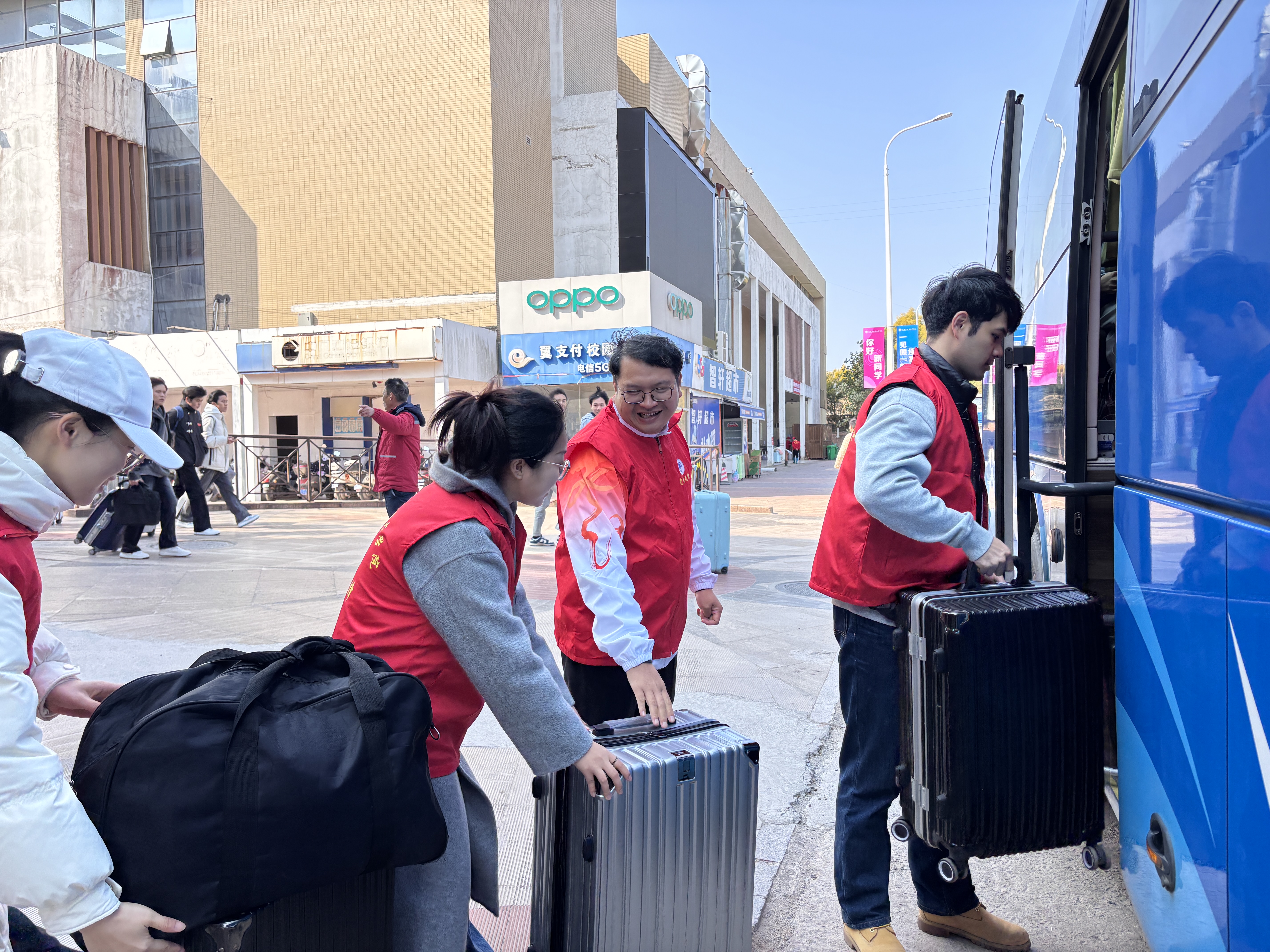 活动现场,身穿志愿服务服装的党员教师们为学生提供搬运行李、引导学生上车购票、耐心解答学生疑问等志愿服务,组织学生有序搭乘学校“定制”公交专线车离校。在志愿服务的过程中,党员教师们不仅身体力行,更是用心服务,与每个归家学生进行亲切交流,叮嘱学生出行及寒假期间安全事项。