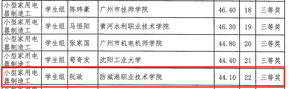 经过激烈角逐,我校智能制造与信息工程学院2022级机电一体化技术专业1班学生阮政喜获小型家用电器制造工赛项全国三等奖的好成绩!