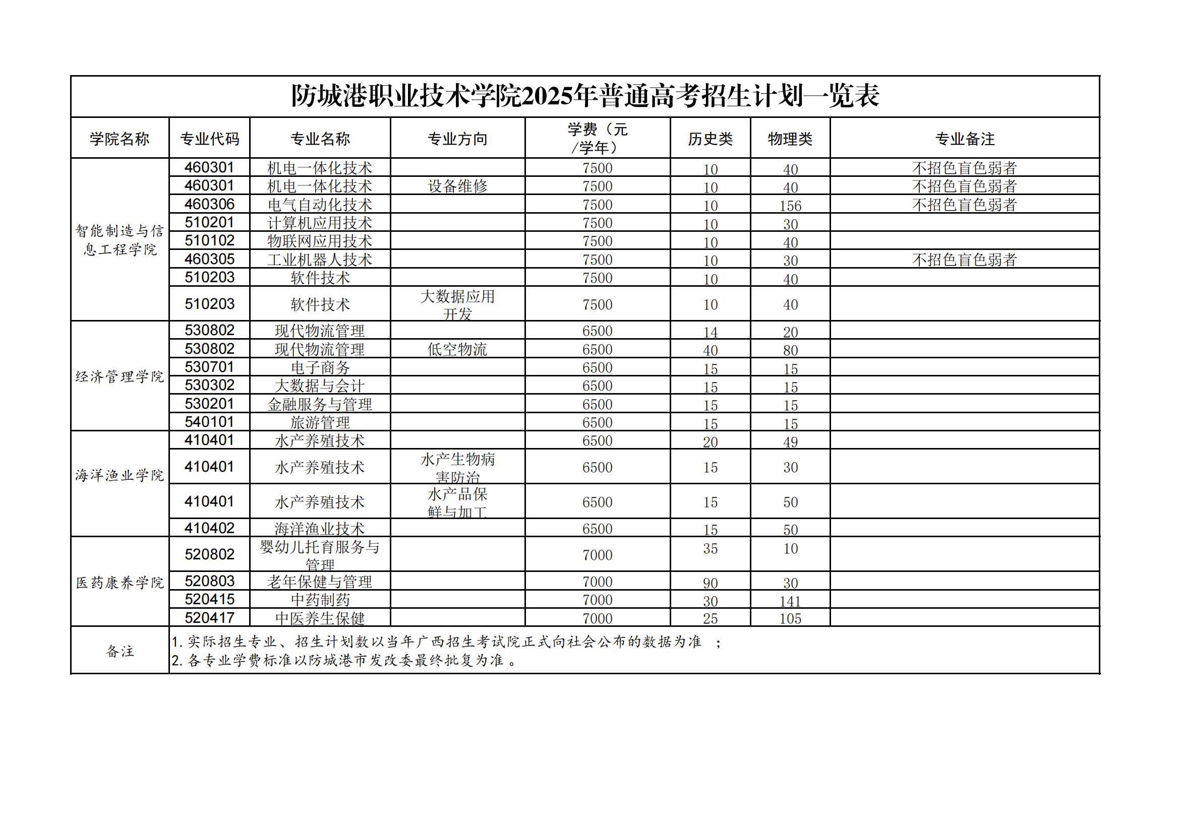 防城港职业技术学院2025年普通高考招生计划一览表