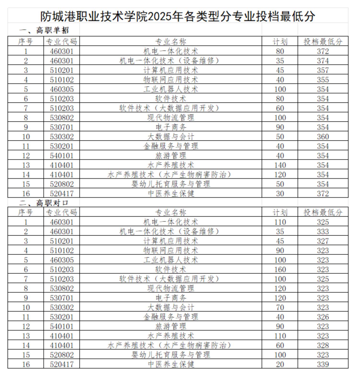 防城港职业技术学院2025年分类考试分专业投档最低分